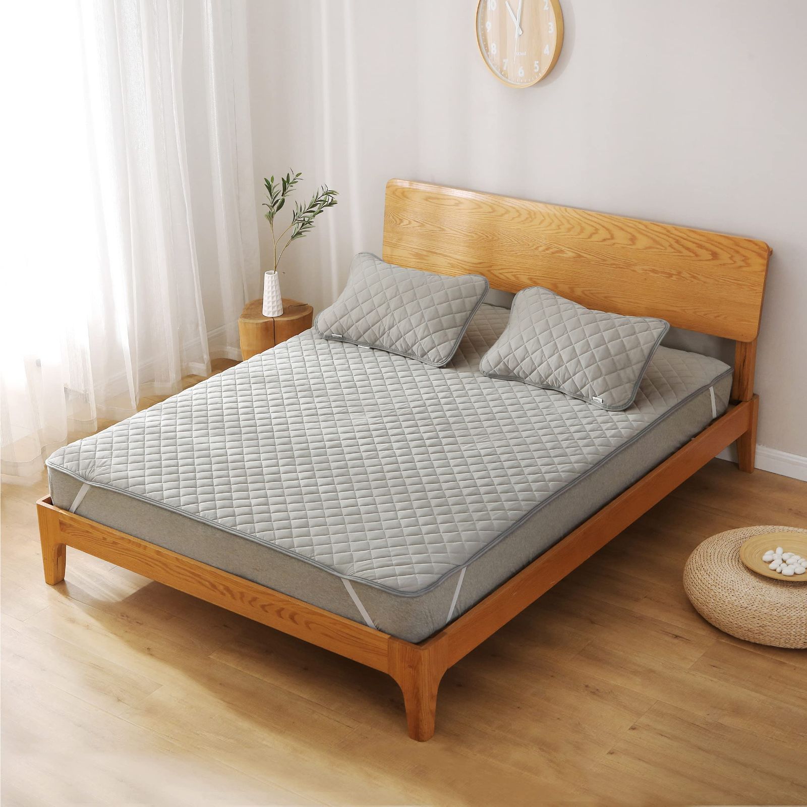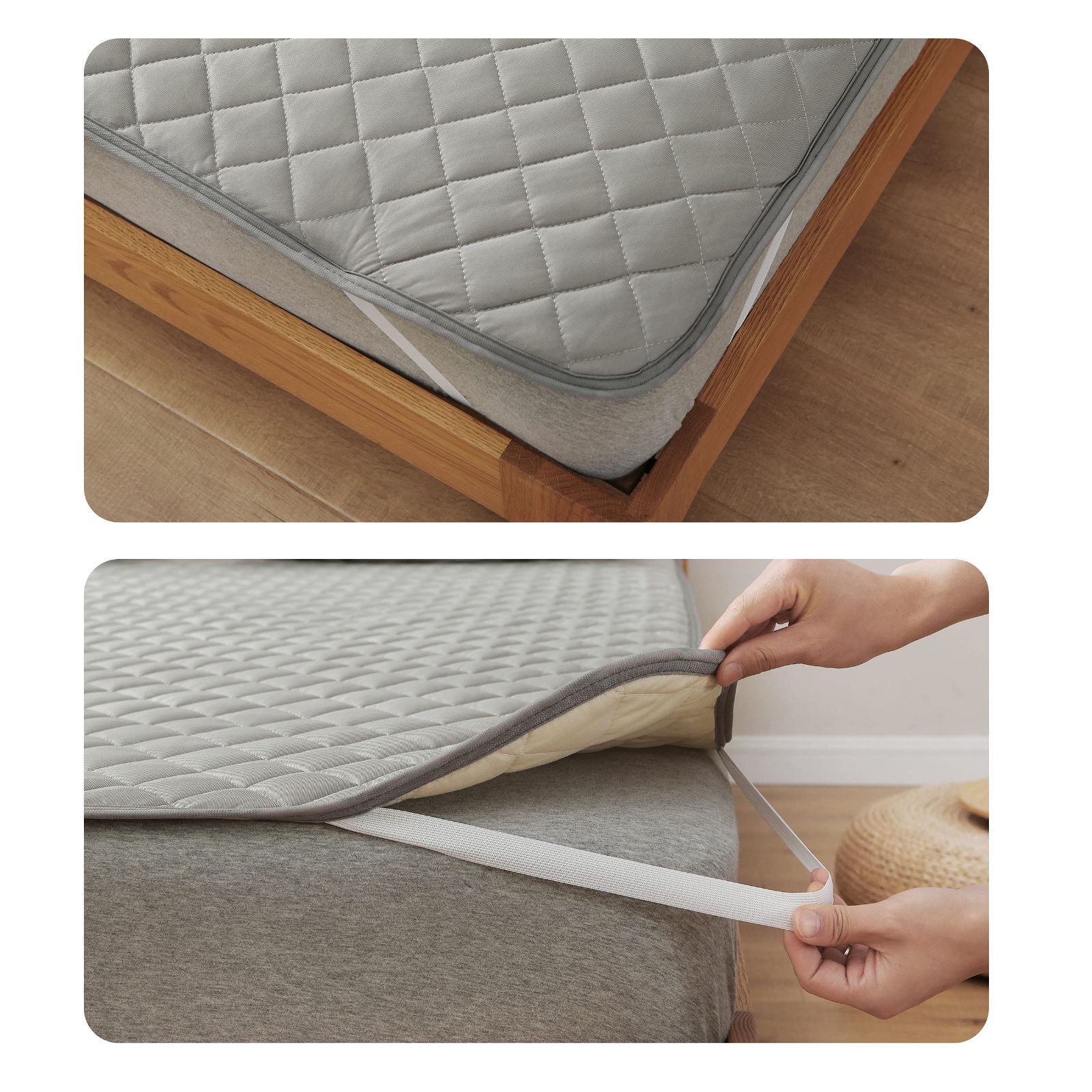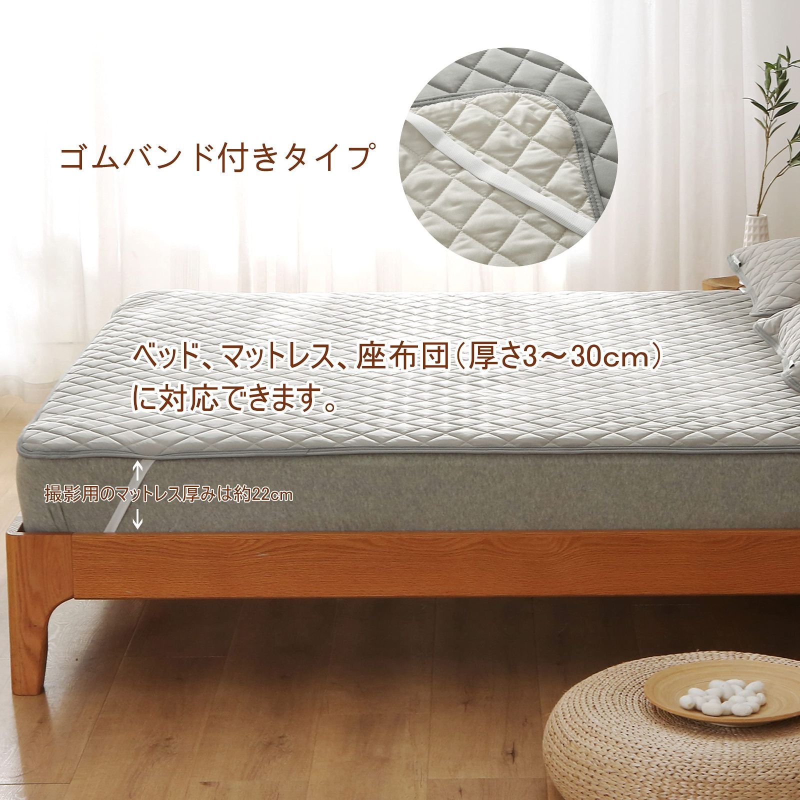 【四隅にゴムバンド】四隅にゴムバンドがついていることで、寝返りしてもしっかり固定できて、朝までぐっすりお休みいただけます。簡単に取り付けが可能です。