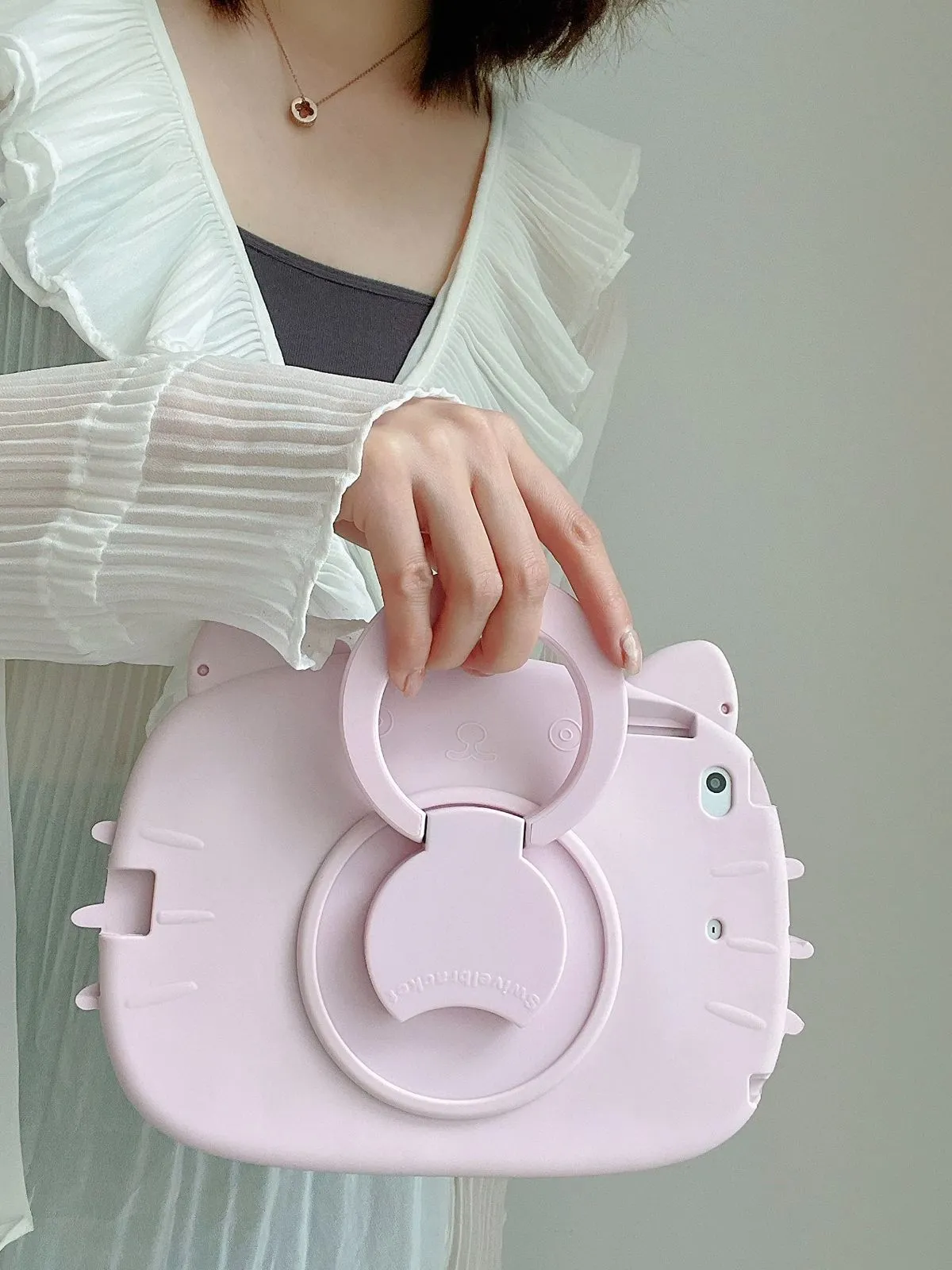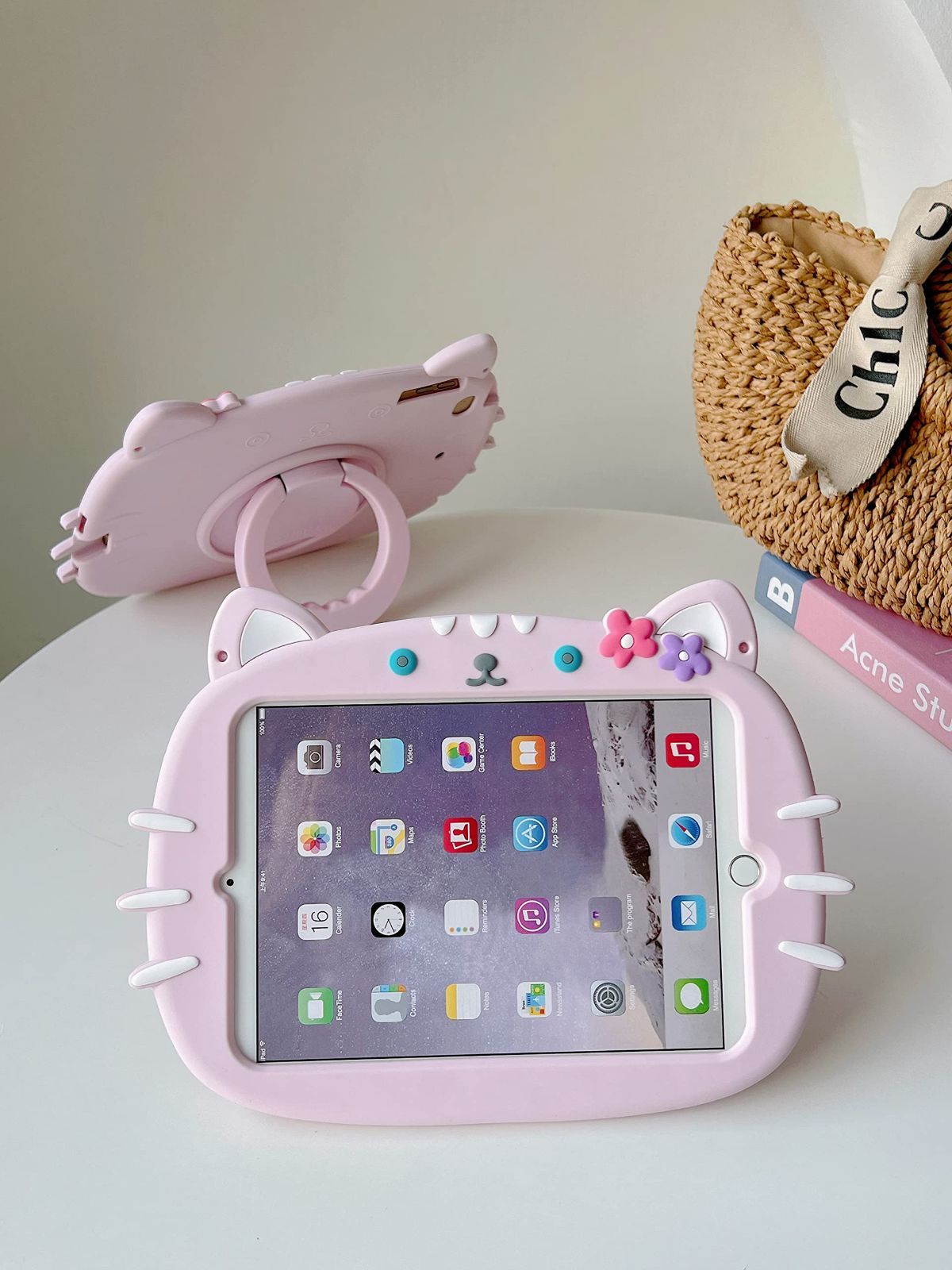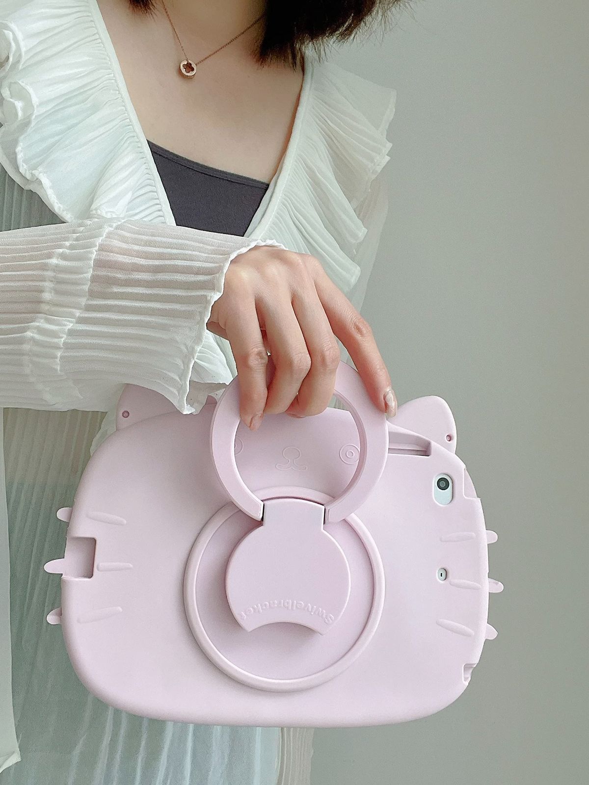 【人気商品】ソフト 軽量 薄型 シリコーン デザイン 猫 ピンク アイパッド 可愛い 付き 保護 ストラップ ショルダー スタンド機能 ケース ケース 横置き カバー 縦置き リング付き 360度回転 耐衝撃 2017 第5世代 / 女性/女の子 2018 第