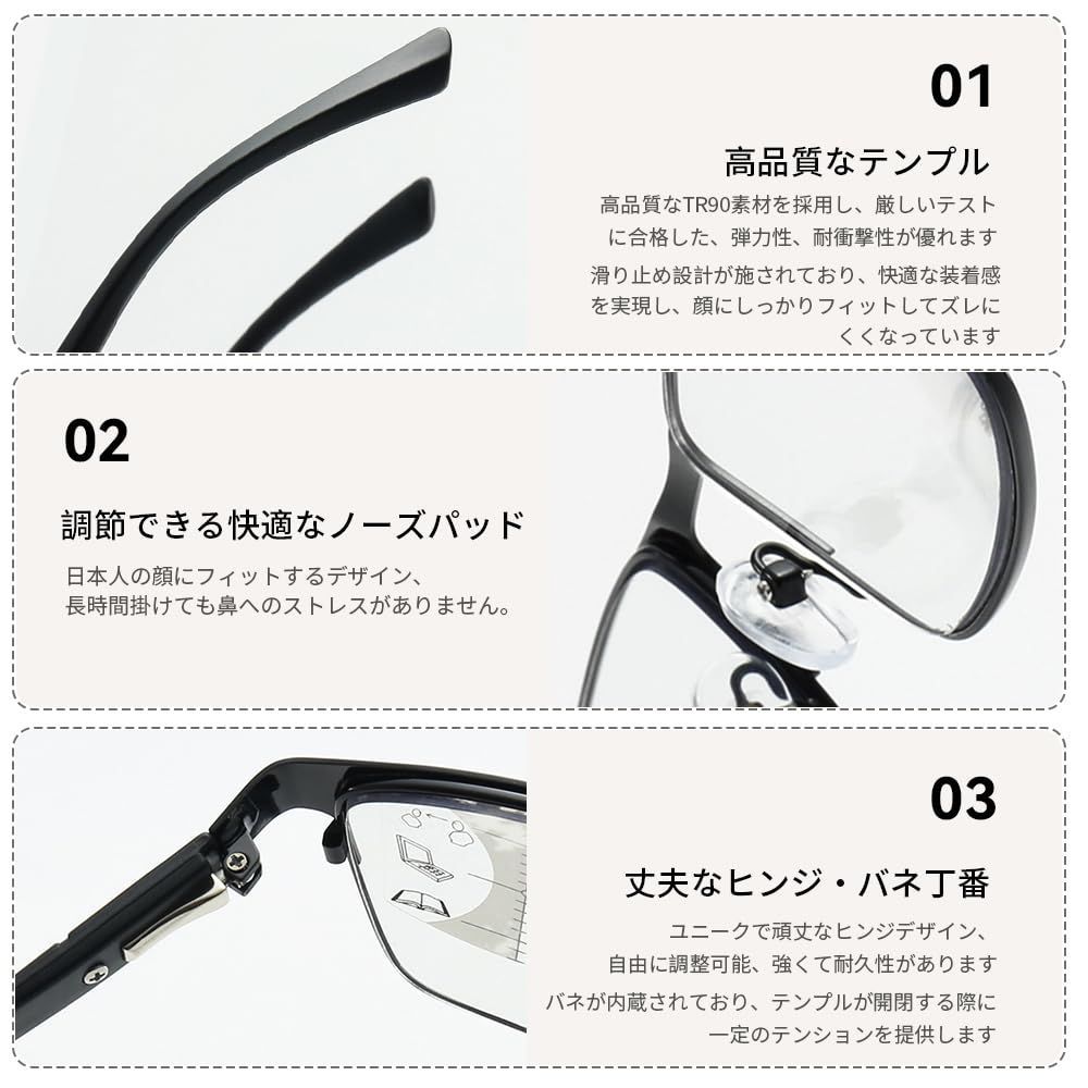 度数範囲:+1.0、+1.5、+2.0、+2.5の幅広い度数を備え、最適なものをお選びいただけます。付属品:外装ケースx1、メガネケースx1、メガネ本体x1、メガネ拭きx1、ブルーライトカットテストセットx1、変色説明書x1、取扱書x1