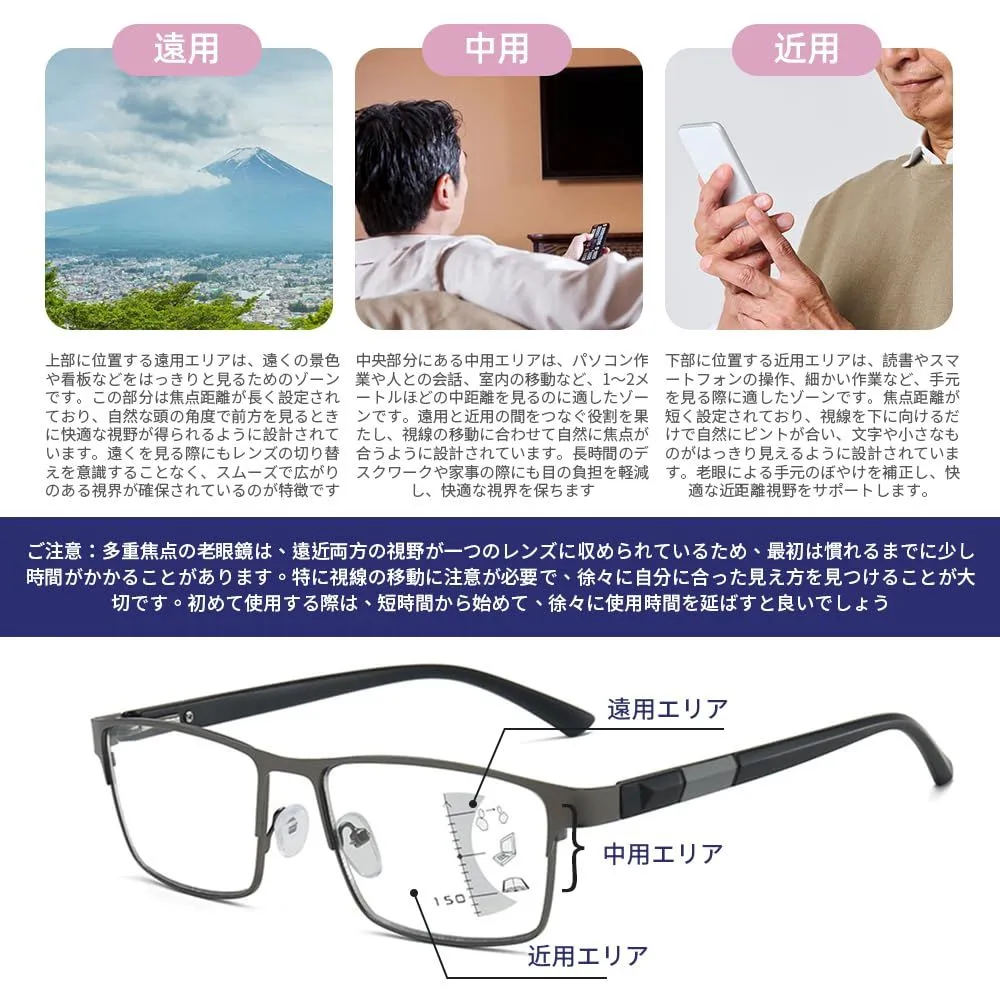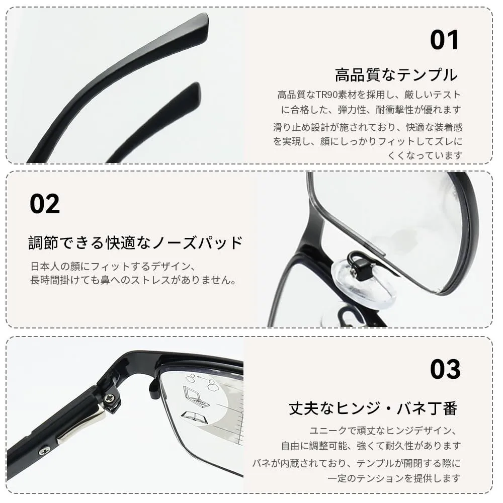 累進多焦点・ブルーライトカット・調光機能:本製品のレンズは、遠・中・近距離の視界に対応する多焦点設計に加え、光の変化に反応して色が変わる調光機能と、目に有害なブルーライトをカットする機能を兼ね備えています。外では紫外線に反応してレンズが自動的に着色し、まぶしさを軽減しながら紫外線から目を守ります。室内ではクリアな状態に戻り、自然な見た目で使用できます。また、ブルーライトカット機能により、パソコンやスマートフォンなどの画面から発せられるブルーライトを効果的に軽減し、目の疲れを抑えるサポートをします。これらの機能が1枚のレンズに集約されているため、室内外を問わず快適に使用でき、日常生活や仕事のあらゆるシーンで活躍する高機能な老眼鏡レンズです