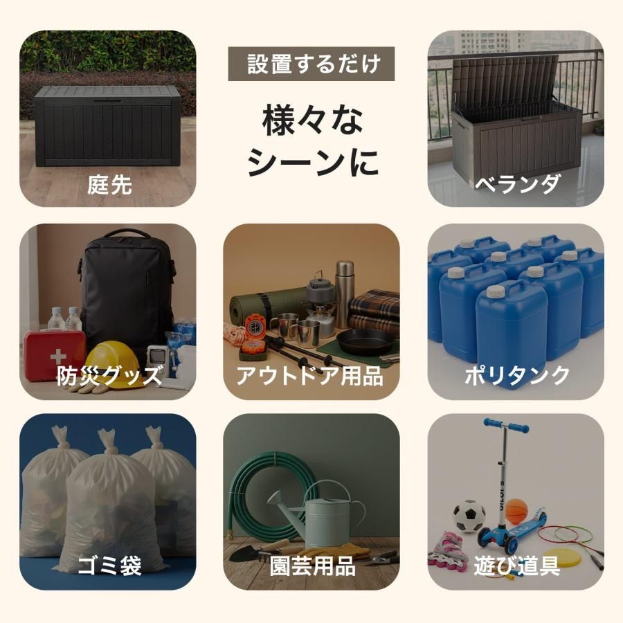 380Lの大容量でガーデニング用品やアウトドアグッズ、ポリタンク、掃除用具、防災グッズまでしっかり収まります。