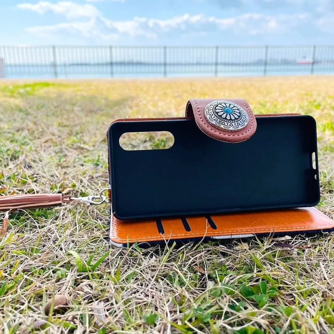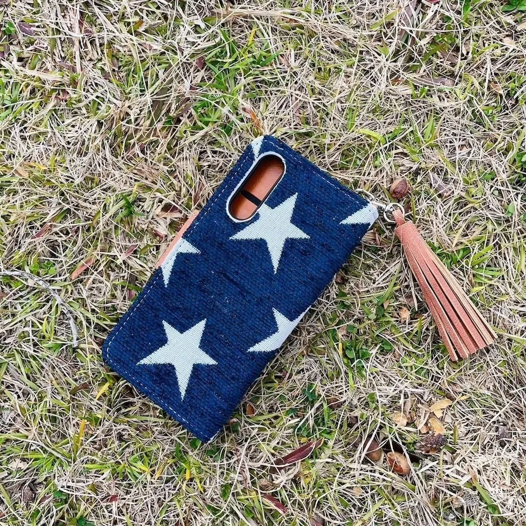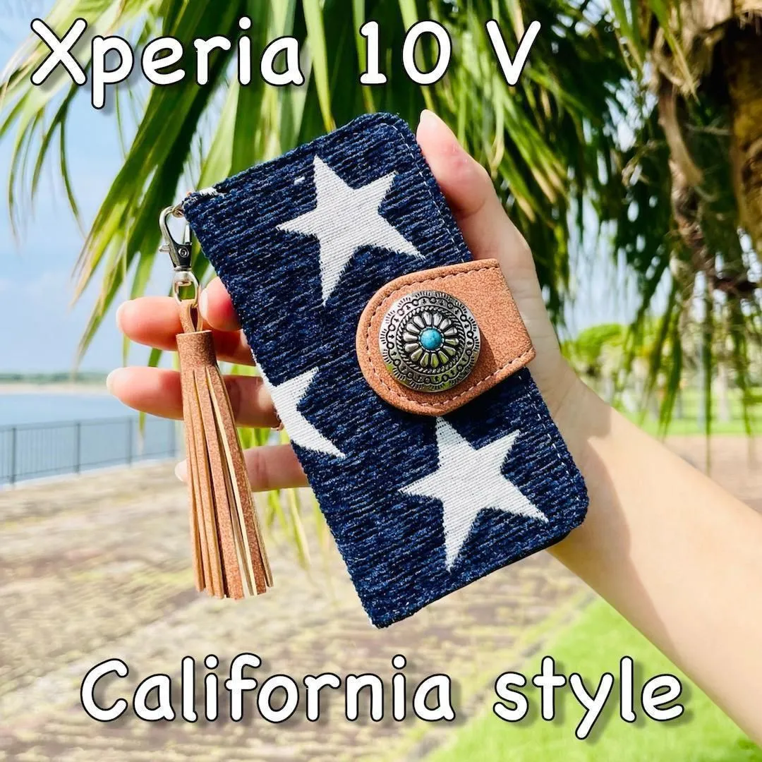 Xperia 10 V レザーケース 星柄 コンチョ タッセルストラップ付 手帳型カバー 西海岸カリフォルニアスタイル サーフスタイル ネイビー