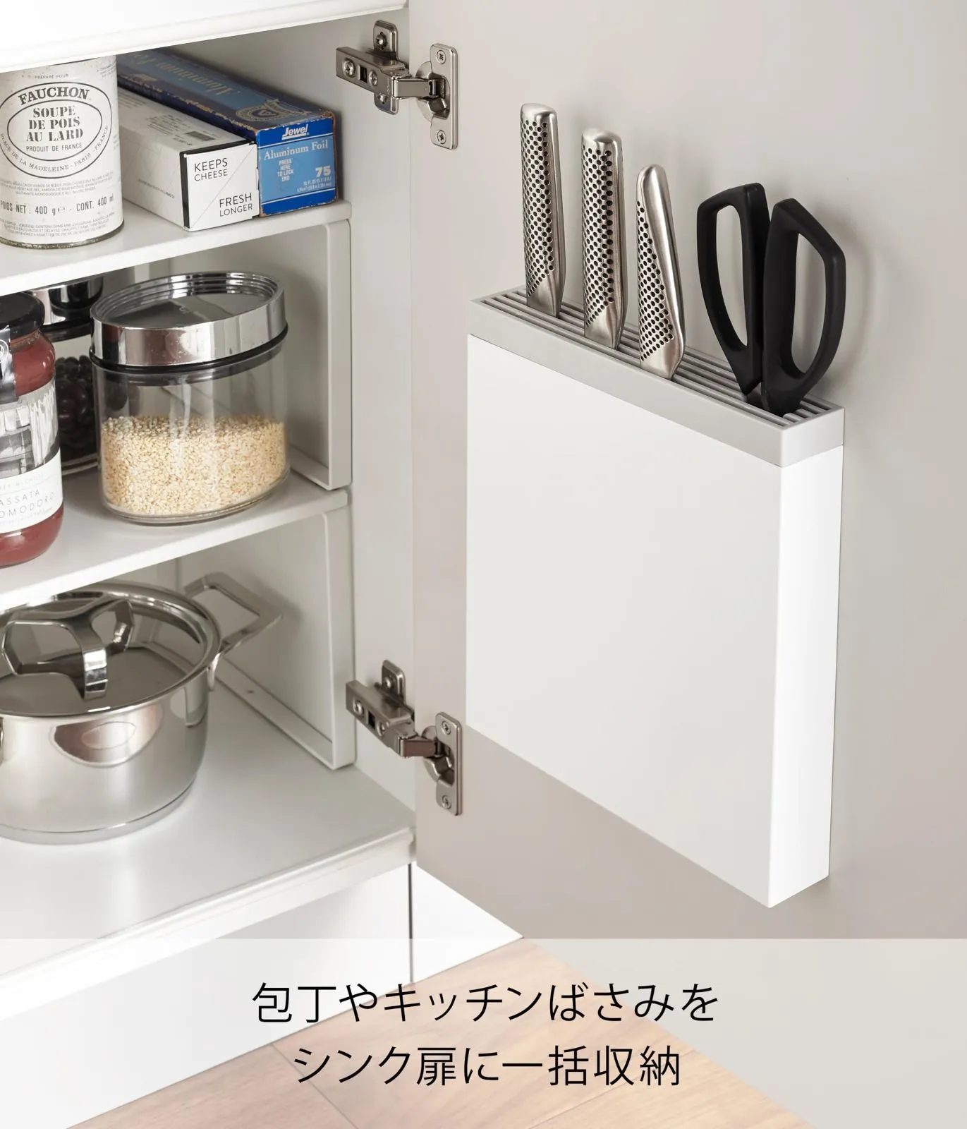 包丁やキッチンばさみをシンク扉に一括収納。