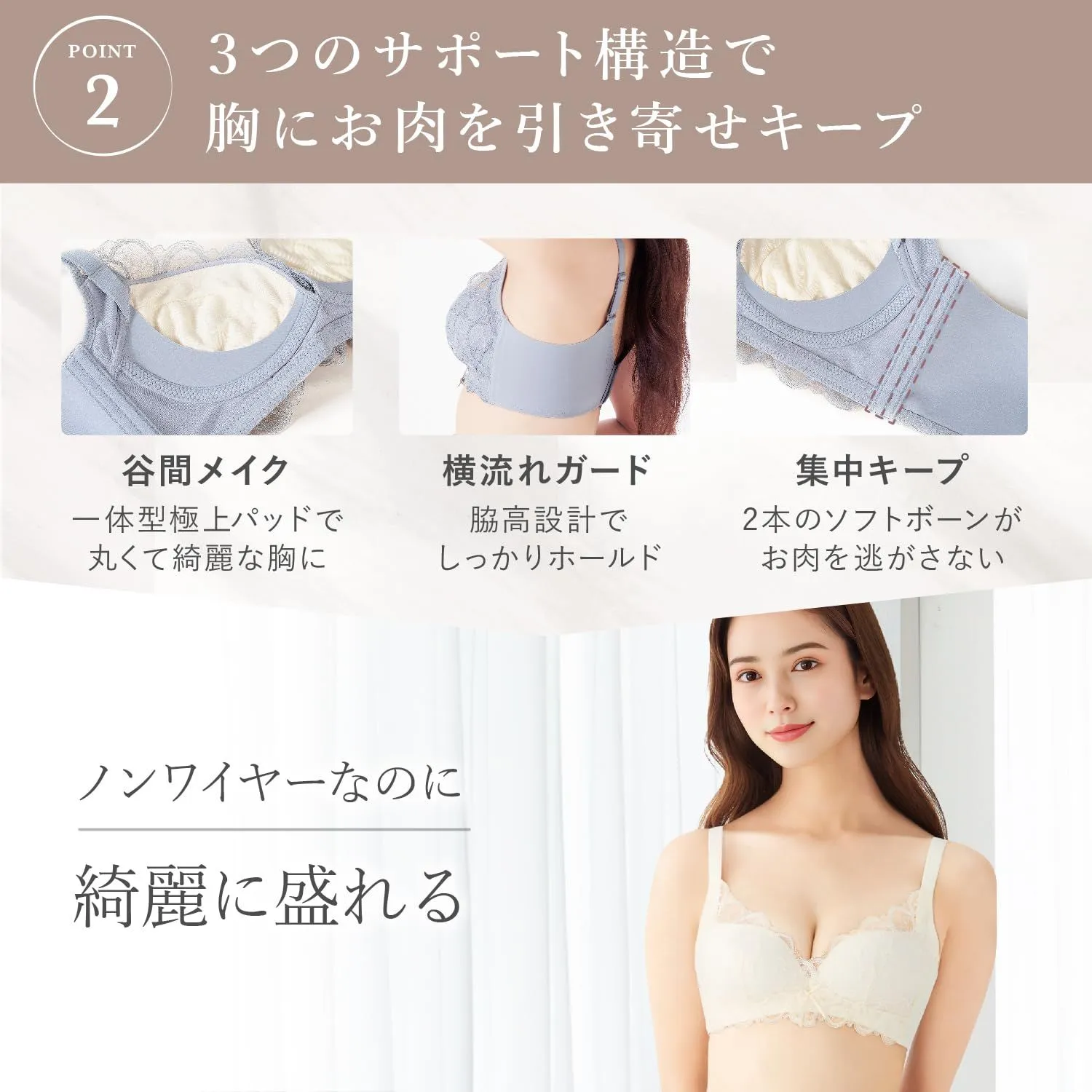 【独自バストサポート構造でふわっと×スリム どちらも手に入れる】 脇高設計が脇肉と背中をしっかり引き寄せて逃さないホールド構造。ふかふかの極上パッドでバストを包み込むように持ち上げ、優しく寄せて丸く綺麗に盛れるブラ。 背中からサイドのお肉は胸に集まりキャッチするので、後ろ姿がすっきり見える!