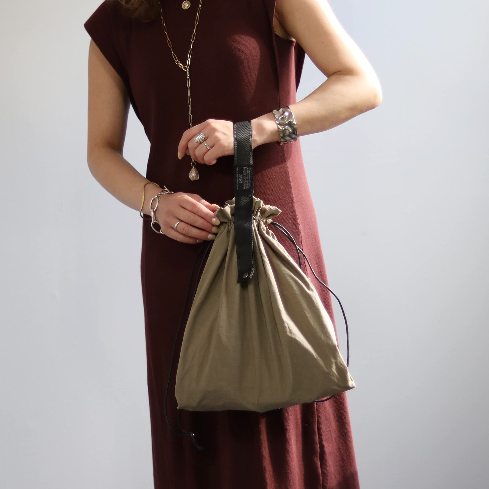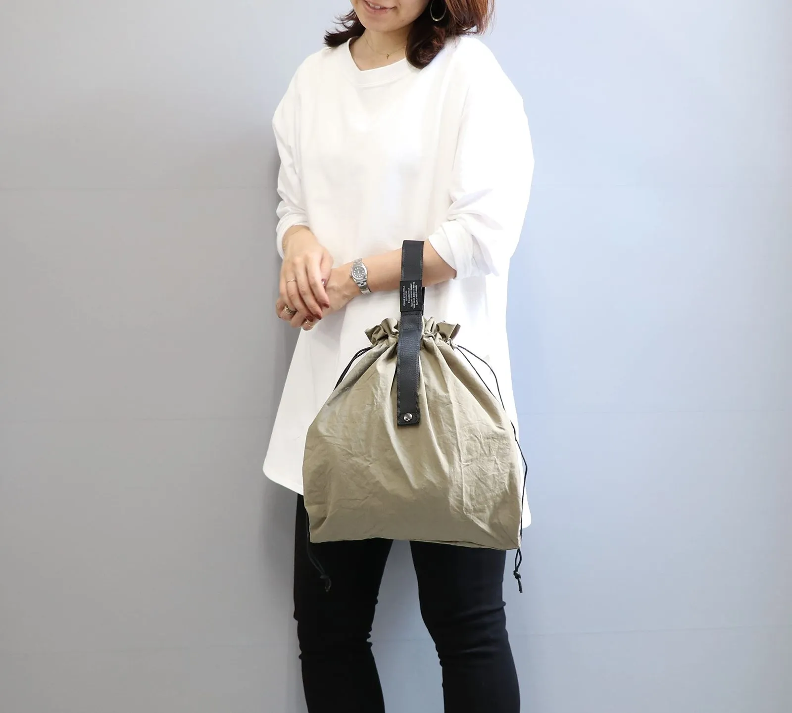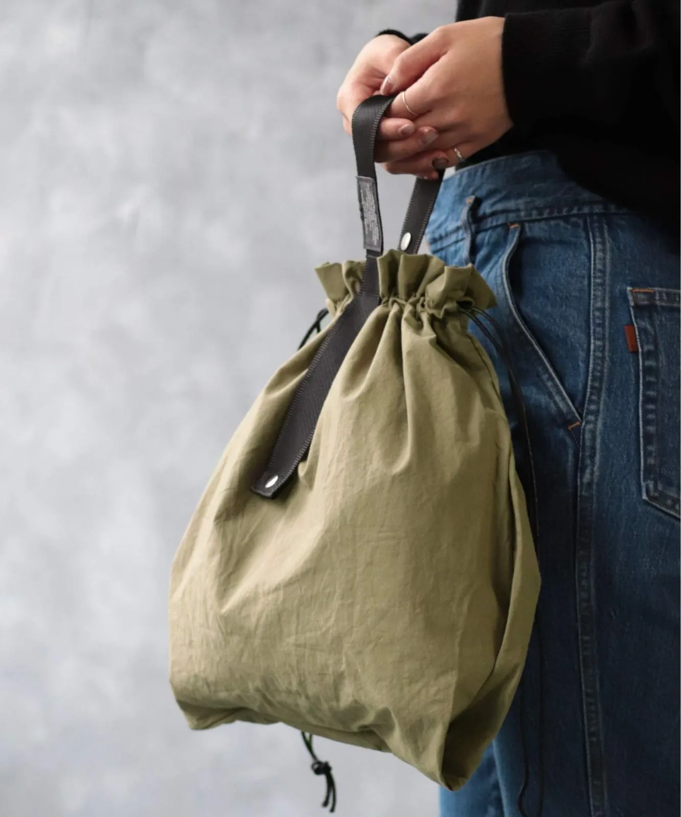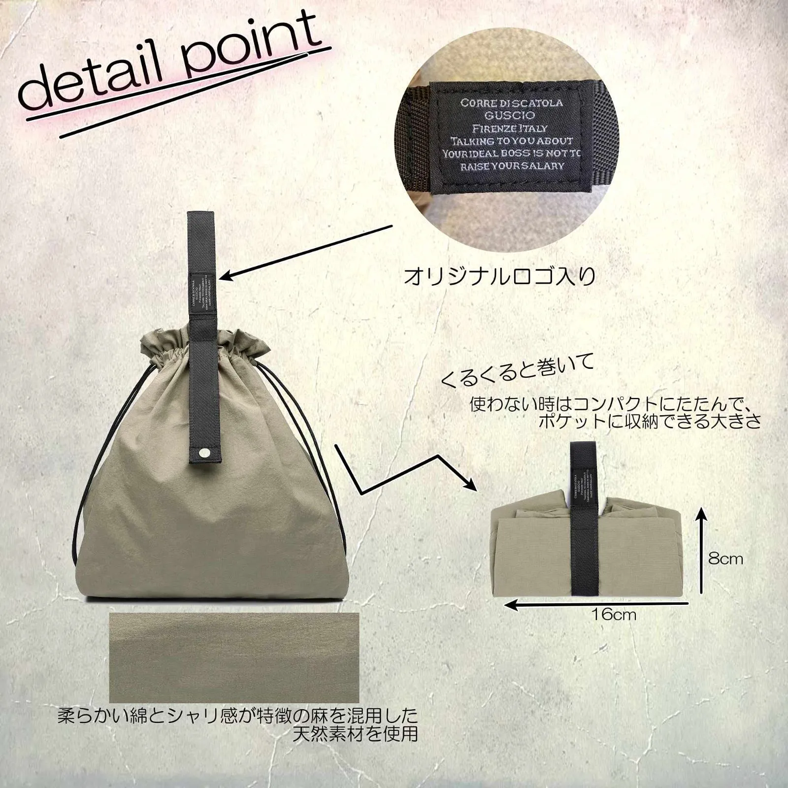 【 畳んだ状態】 幅16cm 高さ:8cm マチ:4cm ①綿麻素材を使用し綿の持つ柔らかさと麻のもつ独特のシャリ感が特徴です。 ②色もアースカラーでナチュラルテイストに仕上げました。 ③コンビニやちょっとしたお買い物の時に便利なサイズになっています。④巾着型なのでコンビニ弁当を入れても傾きにくくなっています。 ⑤普段使いしてもかわいいデザインになっています。