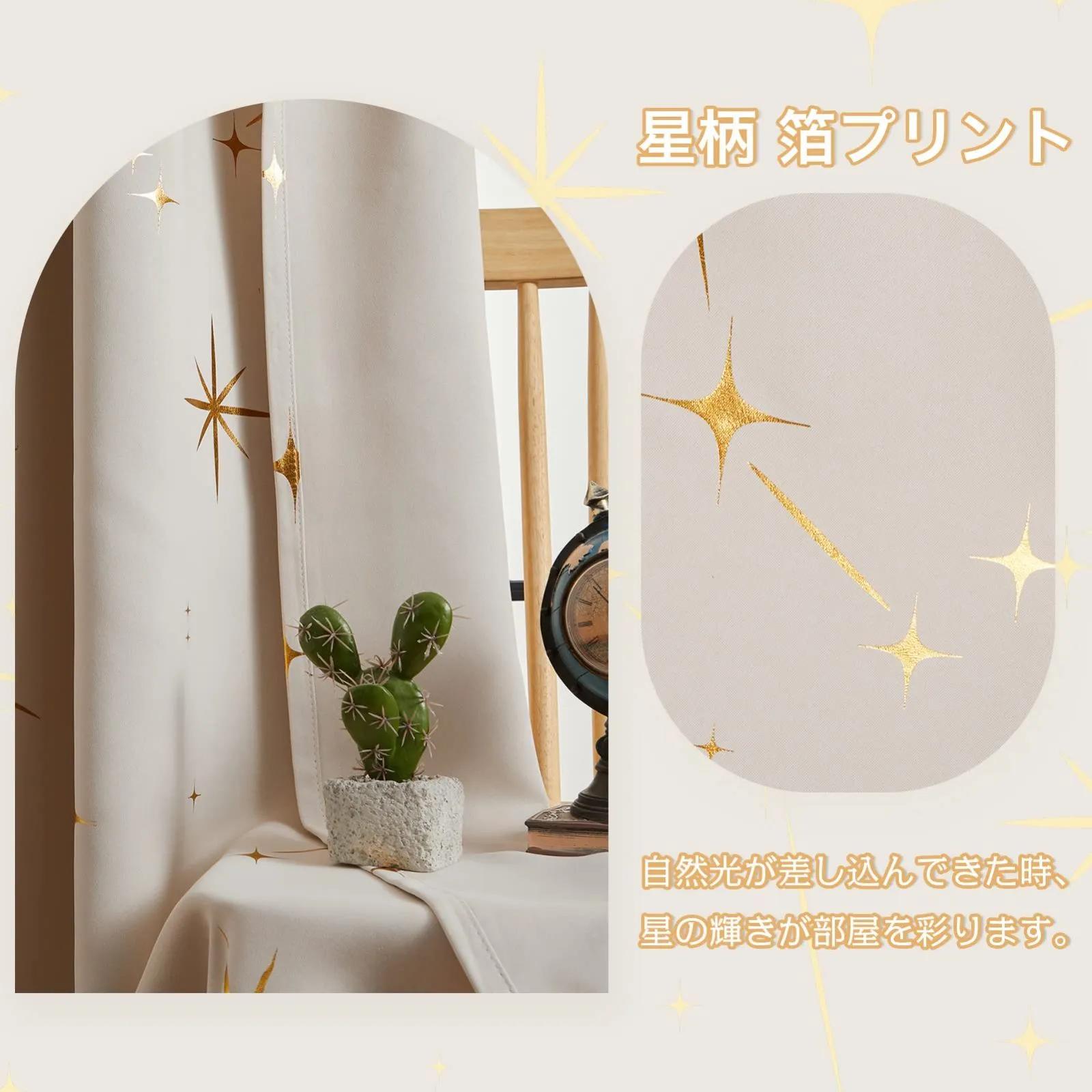 Topfinel カーテン 遮光 おしゃれ 星柄 箔プリント 遮光カーテン 110cm丈 2枚組 ベージュ 小窓 カフェカーテン 省エネ 断熱 寝室 防音カーテン 既成 カーテン 断熱カーテン