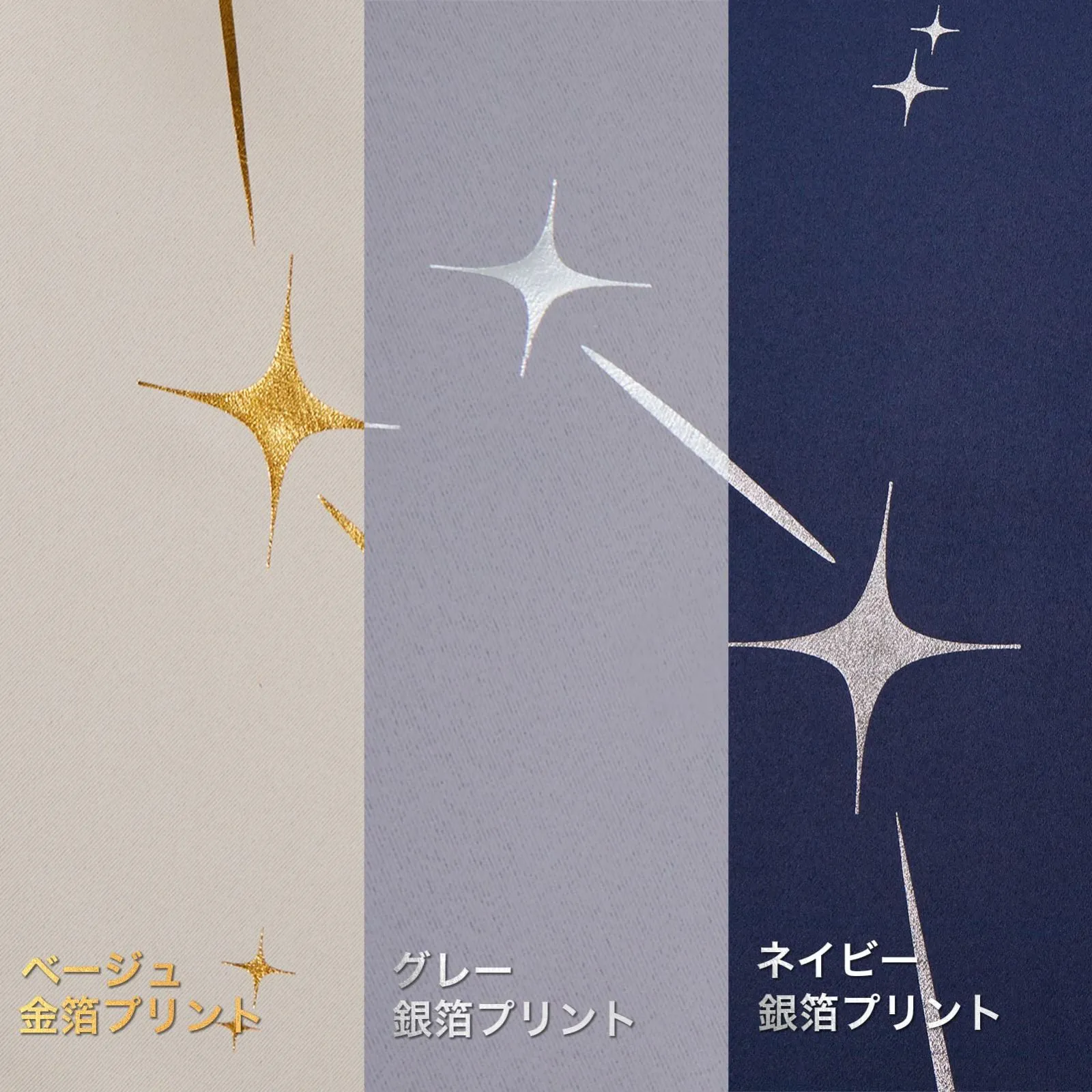 【デザイン】:箔プリントで星柄が綺麗なカーテン。光の当たり具合により箔プリントがキラキラ光って見えます。シンプルでユニークなデザインは、退屈することなく、いつでも楽しむことができます。