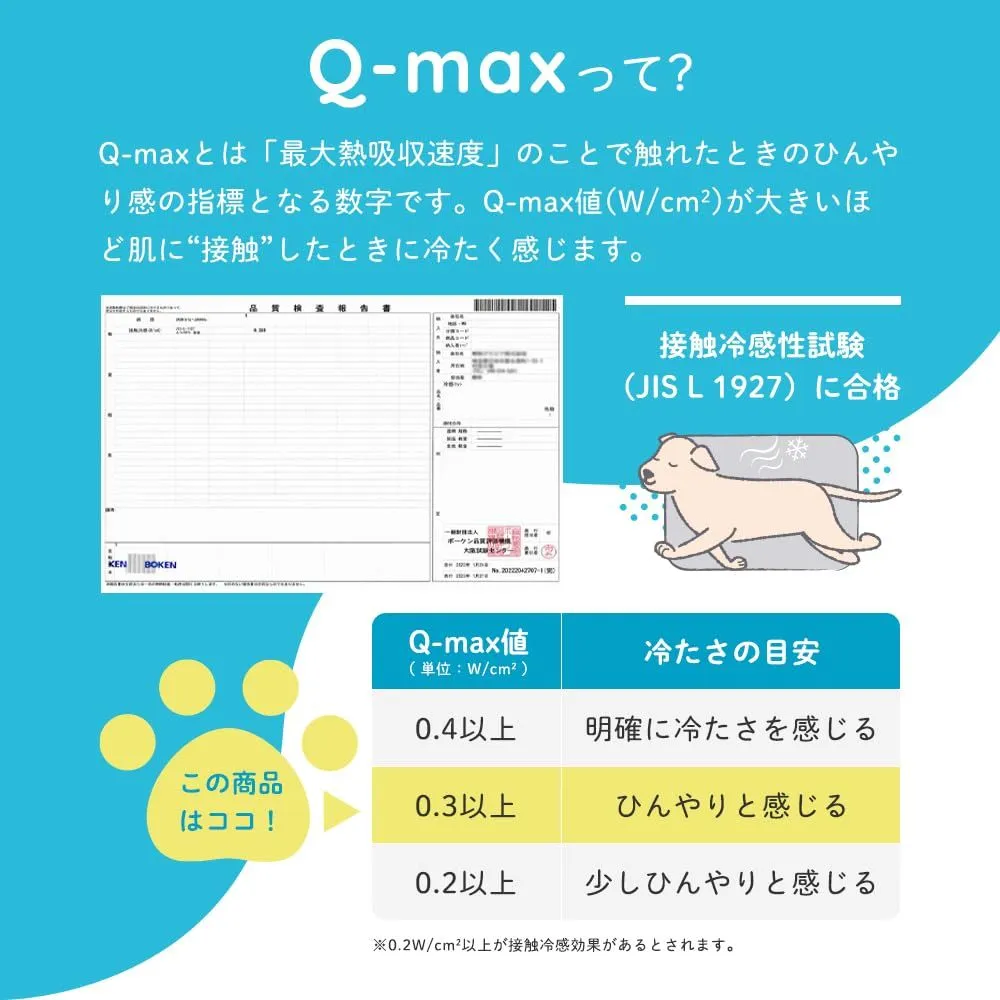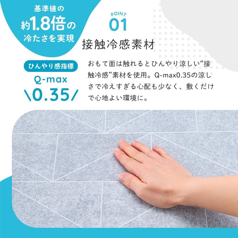 【接触冷感素材】おもて面は触れるとひんやり涼しい接触冷感素材を使用。Q-max0.35の涼しさで冷えすぎる心配も少なく、敷くだけで心地よい環境に。基準値の約1.8倍の冷たさを実現をしました。Q-maxとは:「最大熱吸収速度」のことで触れたときのひんやり感の指標となる数字です。Q-max値(W/cm2)が大きいほど肌に接触したときに冷たく感じます。