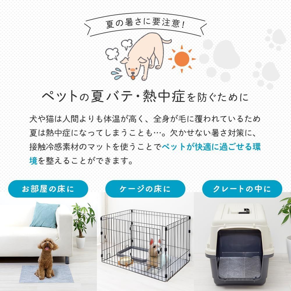 【夏の暑さ対策に】敷くだけでひんやり気持ちいい環境に「ペットのためのひんやりマット」。犬や猫は人間よりも体温が高く、全身が毛に覆われているため夏は熱中症になってしまうことも…。欠かせない暑さ対策に、接触冷感素材のマットを使うことでペットが快適に過ごせる環境を整えることができます。夏の始まりからひんやりマットは大活躍!ペットの夏バテ・熱中症を防ぐために。大切な家族の夏の必需品に、快適な夏をペットと一緒に!お部屋の床に、ケージの床に、クレートの中に、様々なシーンで使用できます。