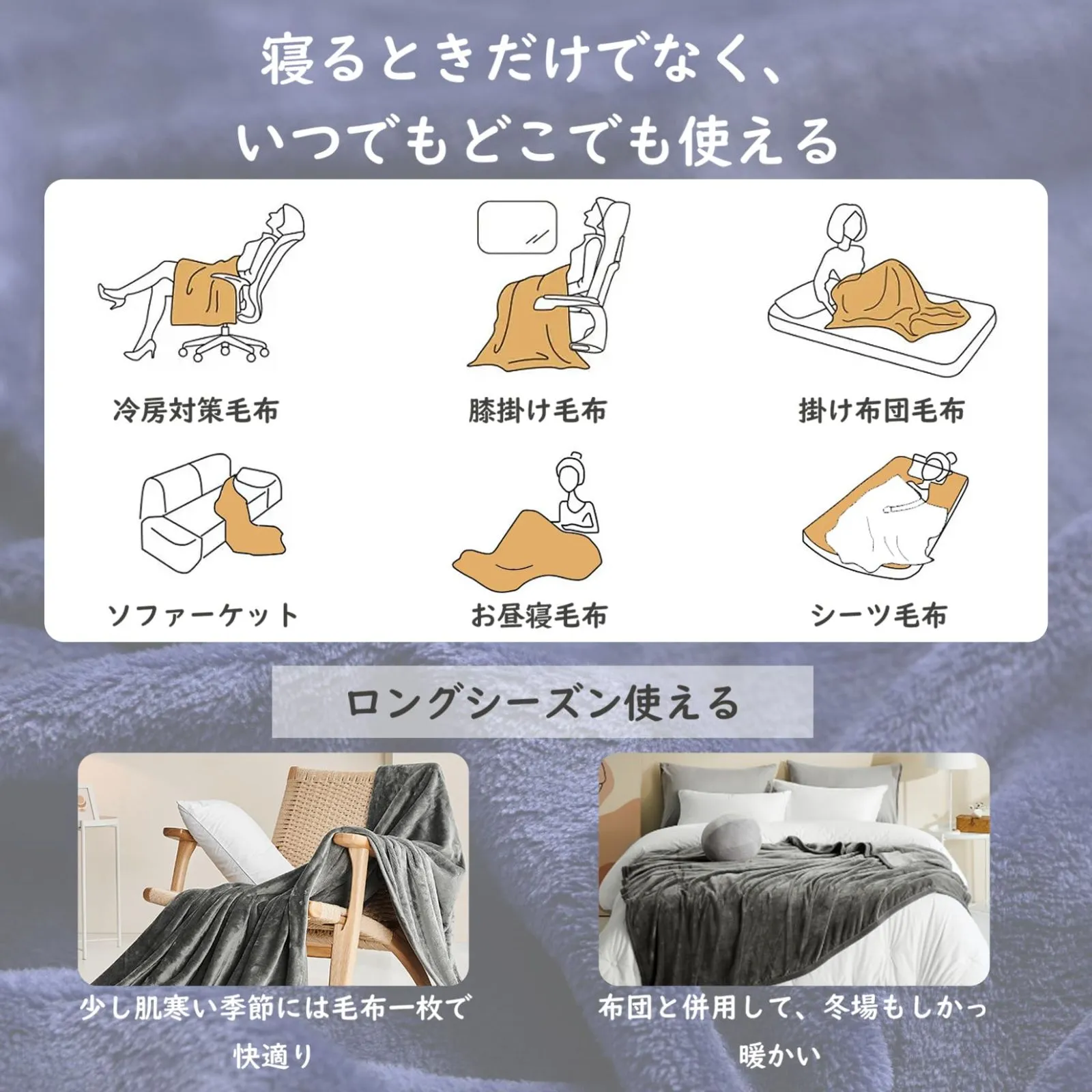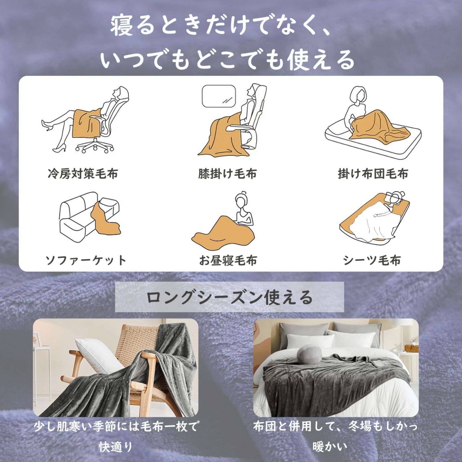 「様々なシーンで大活躍」ブランケット、掛け毛布、ひざ掛けとしてご使用いただけるだけてはなく、保温シーツとしても最適。軽いから持ち運びやお出かけにも便利で、オフィスで昼寝毛布、旅行や車内用毛布、またキャンプ等のアウトドア活動においても活用いただけます。