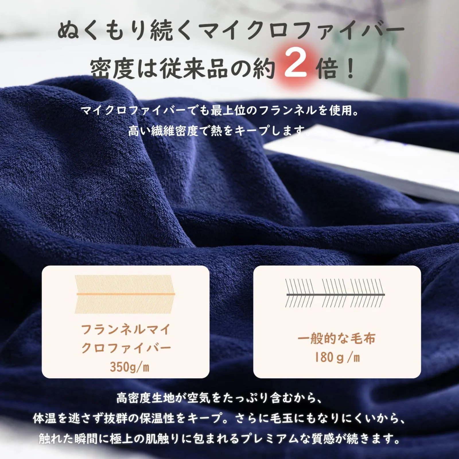 「軽さと暖かさを両立する」高密度の超極細繊維がちゃんと詰まっていて、ふわふわで柔らかいお化粧パフのようなブランケットが出来ました。軽い掛け心地は維持したボリュームタイプは、体温を逃さず抜群の保温性をキープ、重たい毛布が苦手な人にもおすすめです。