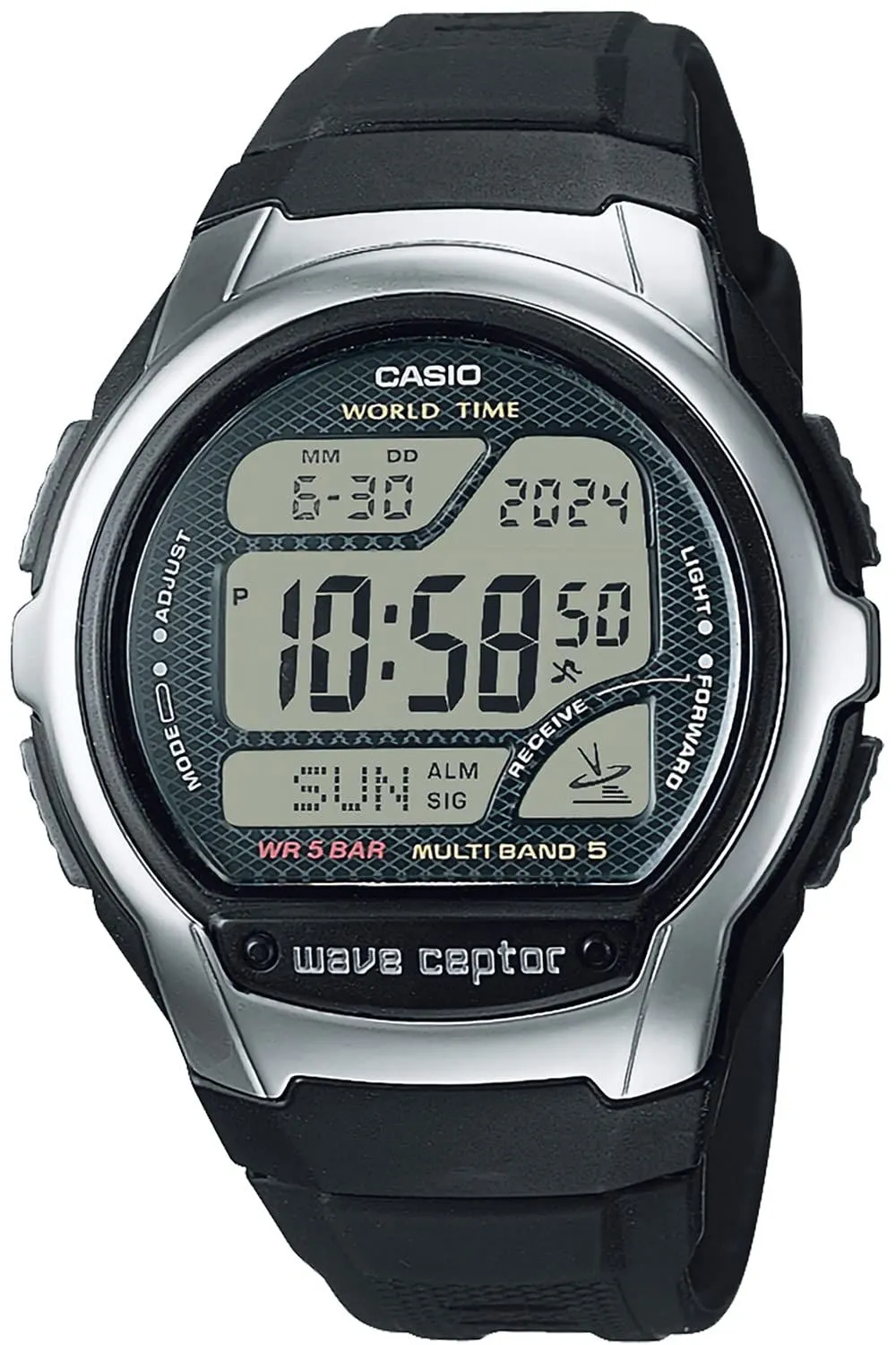 【国内正規品】電波時計 WV-58R-1AJF メンズ ブラック セット内容:本体、ボックス、取扱説明書、書は取扱説明書に付属 防水仕様:5気圧防水機能 電波時計 ワールドタイム GMT/UTC アラーム