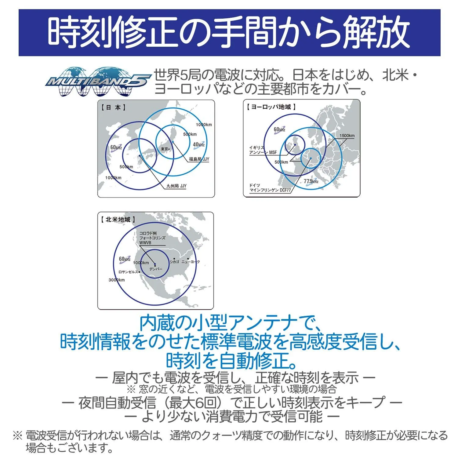 ●電波受信機能:自動受信(最大6回/日)/手動受信、<日本>受信電波:JJY、周波数:40kHz/60kHz(福島/九州両局対応モデル )<北米地域> 受信電波:WWVB、周波数:60kHz<ヨーロッパ地域>受信電波:MSF/DCF77、周波数:60kHz/77.5kHz *ホームタイム設定を受信可能な都市に設定すると、都市に合わせた局を受信します。尚、時差は選択した都市によって設定されます。