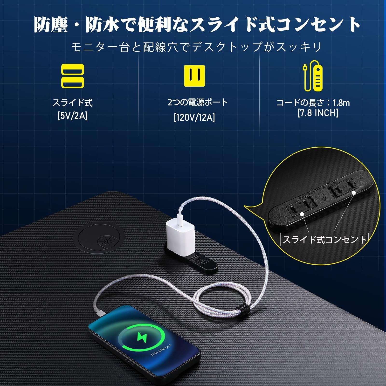 【高級感溢れるカーボン調&人気の理由】ファッショナブルなデザインと高級感あふれるカーボン調のゲーミングデスク。コンセント付き、可動式棚、モニター台、配線穴、物の落下防止の仕切り板など、便利で機能的なデザイン。美しさと実用性を兼ね備えた究極の選択です。