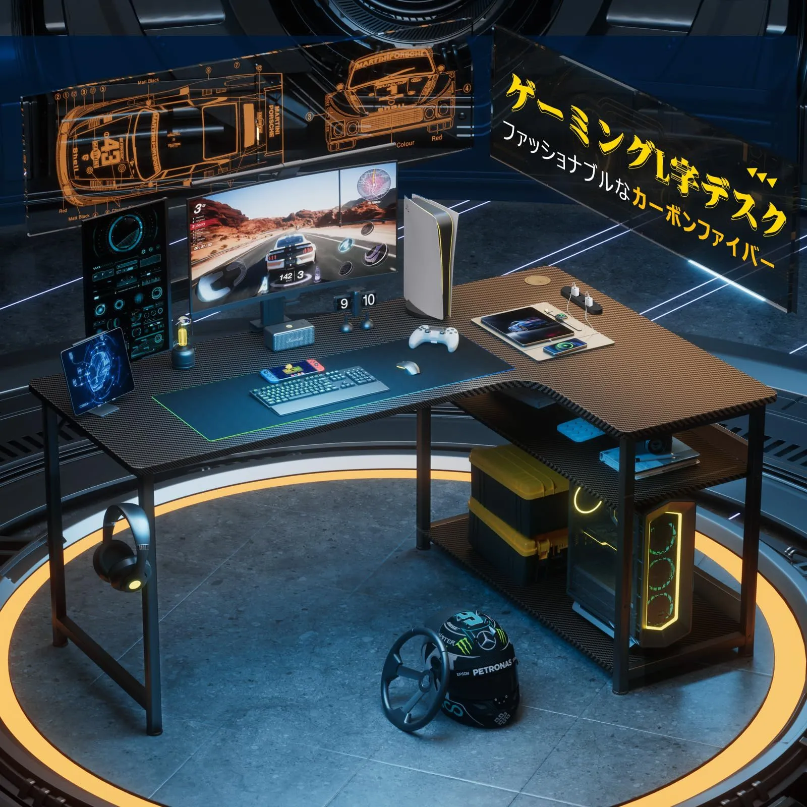 GTRACING ゲーミングデスク カーボン調 コンセント付き パソコンデスク L字 ラック付き モニターアーム対応 棚高さ調節可能 配線穴 右棚 79奥行き*110幅*74.5高さ DL001 ブラック 机 pcデスク 勉強机 ゲームデスク 棚付きl字デスク オフィス 書斎 ワーク