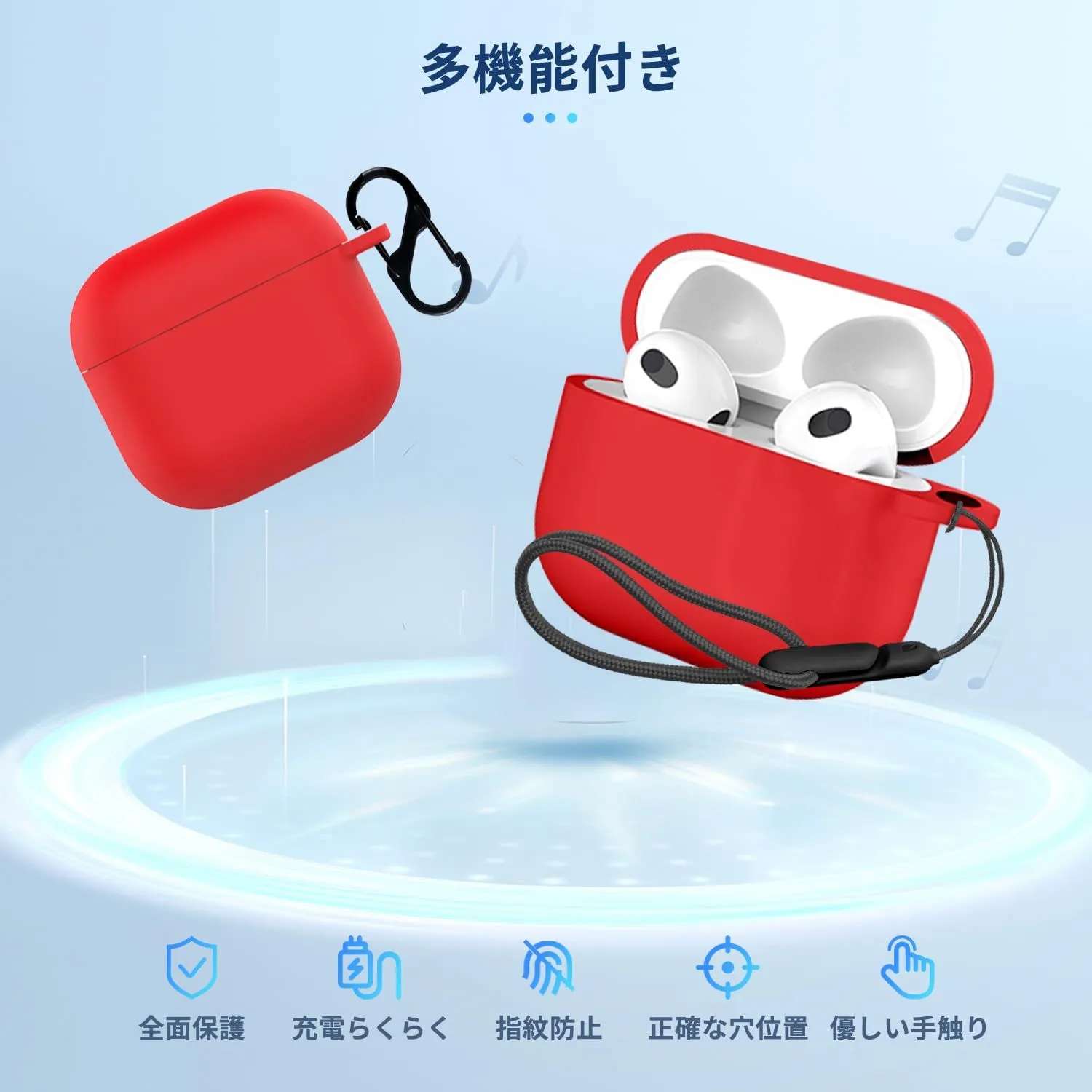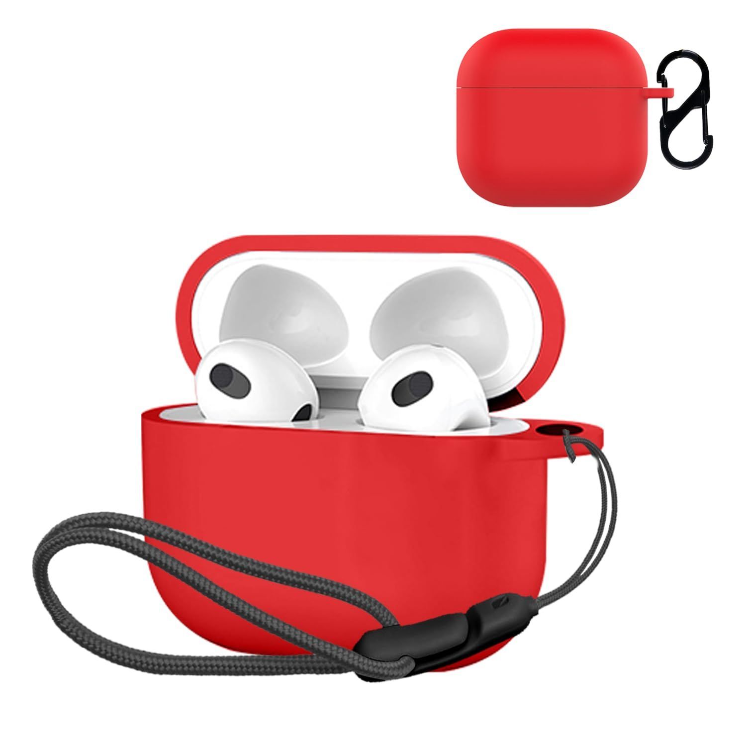 【新着商品】(カラビナ付き+ストラップ付き ) 保護ケース 落下防止 シリコン イヤーホン キズ防止 ワイヤレス 耐衝撃 【NOUKAJU】 カバー 装着充電可能 ケース 防水 用 4 防塵 AirPods (レッド) For