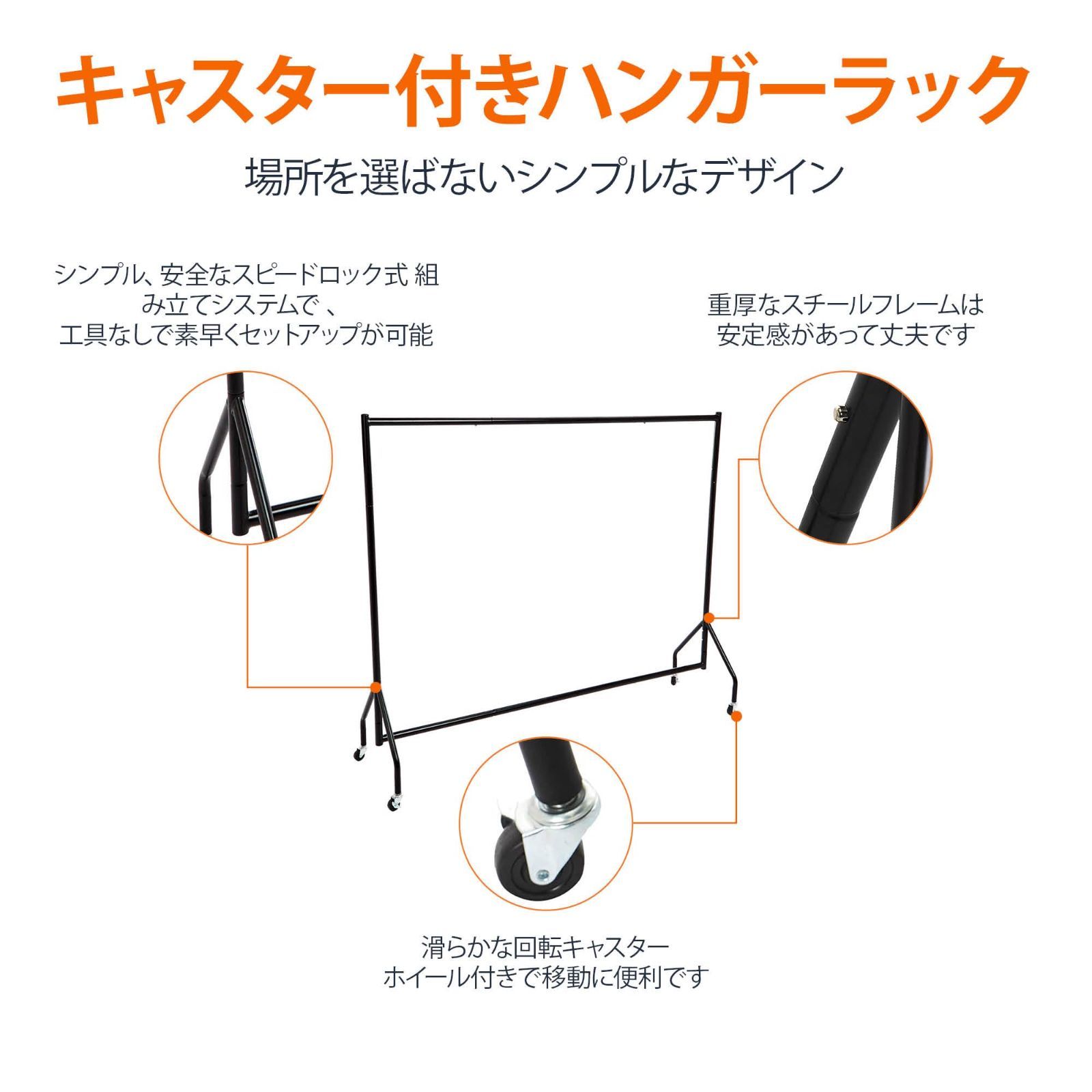 【即日発送】頑丈 キャスター付き長さ1.82×高さ1.52m 洋服ラック ハンガーラック ブラック ベーシック