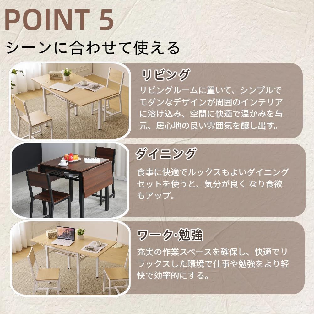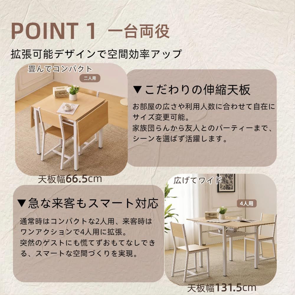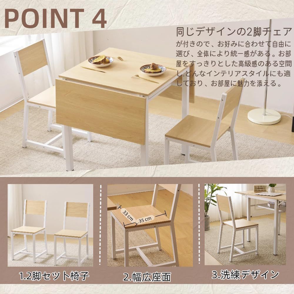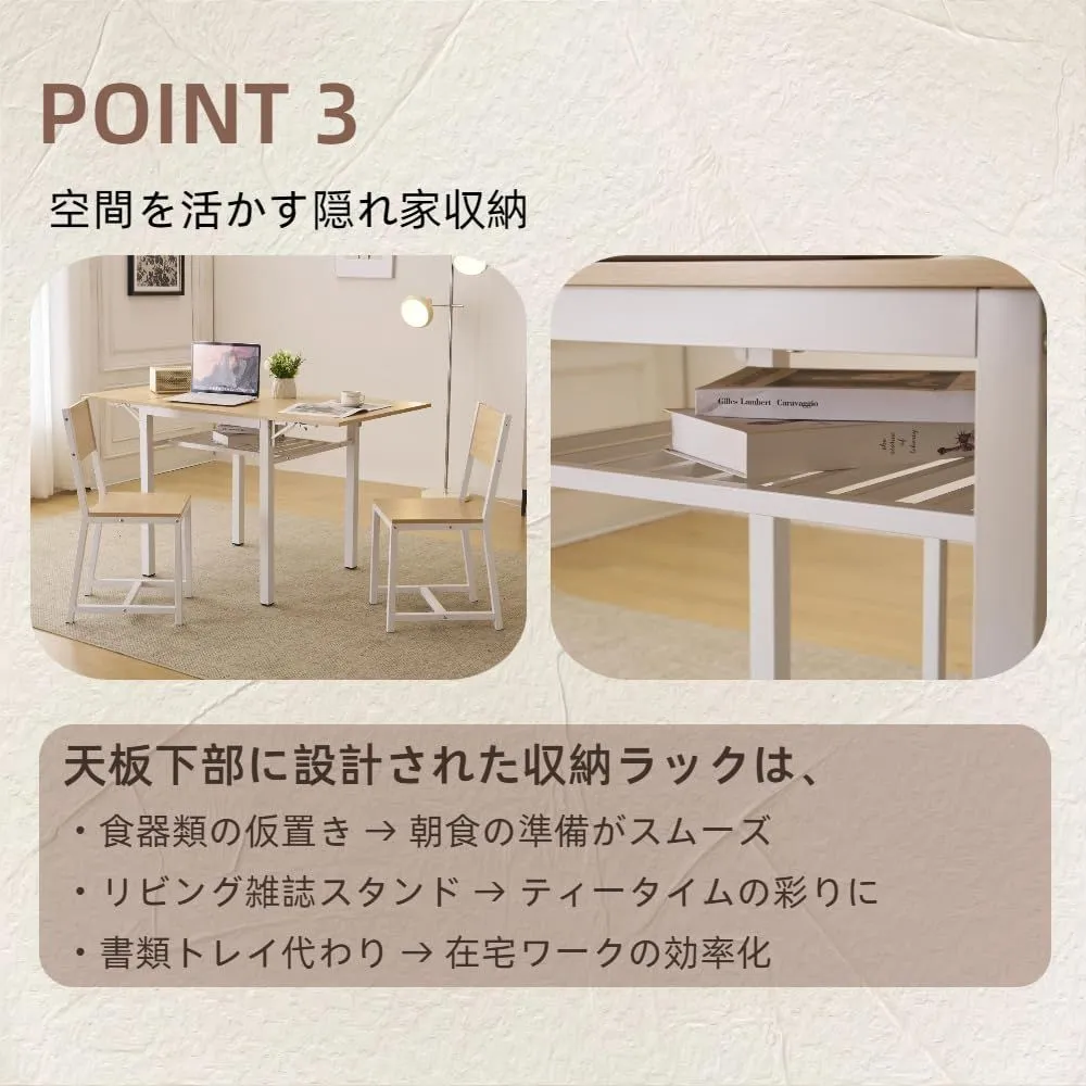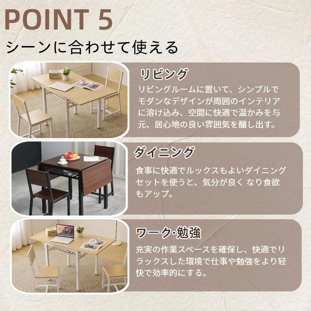【安定性と耐久性を備える構造】天板の連結部分には頑丈な金属フレームを採用し、耐荷重、防水性、防錆性にも優れ、長く愛用でき、安定感抜群! 温かく心地よいダイニングスペースをお届けする。 折りたたみ式でスペースを節約し、来客時にも便利。テーブルの雰囲気に合わせて、3脚の椅子がセットになっており、どんなインテリアにも自然に溶け込む。 最後までご確認頂き誠にありがとうございました。 上記をご確認頂き、ご購入いただけましたら幸いです。 何かご不明な点がございましたらお気軽にメッセージからお問い合わせ下さい。