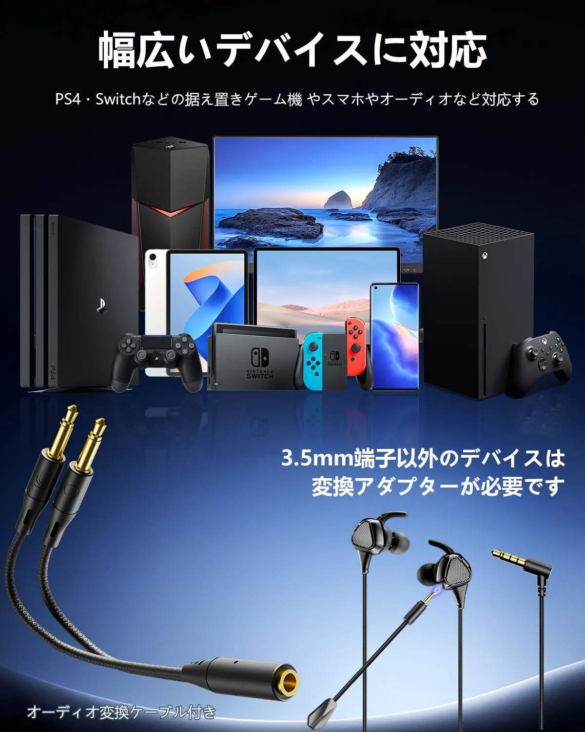 【2025新登場】ゲーミングイヤホン TTQT 有線 イヤホン デュアルマイク搭載 ゲーミングいやほん ヘッドセット マイクミュート機能付き 3Dサラウンド 簡単操作 軽量設計 人気モデル PS4・PS5・Switch・Xbox One・PC・スマートフォン・タブレット・ノートパソコン対応 リモートワークやオンライン会議、エンターテインメント、ゲームに最適 高品質イヤホン、没入型サウンド体験:このゲーミングイヤホンは、高い遮音性を持つインイヤーデザインを採用しており、周囲の雑音を気にせずゲームに集中できる環境を提供します。10mmドライバーユニットを搭載し、クリアな高音質と力強い低音を実現しました。優れた定位機能により、ゲーム内の環境を音声だけで正確に把握することが可能です。敵の位置や距離を的確に判断できるため、より没入感のあるゲーム体験を提供します。また、音質の明瞭さにより、音楽鑑賞や通話など、さまざまな用途にも理想的な選択肢となります。 マイクミュート機能・デュアルマイク搭載:ワンタッチでマイクのオン・オフを簡単に切り替えることができます。取り外し可能なブームマイクとインラインマイクを搭載しており、個人の好みに合わせてマイクの位置を調整可能です。スマートフォンゲーム、PS4、PS5、そしてNintendo Switchなどのゲームで、ゲーム実況やボイスチャット、ビデオ通話がより快適になります。さらに、インラインマイクは日常の通話やリモートワーク、LINEでのチャットにも便利に使用できます。 人間工学デザイン・L字型プラグ設計:この有線ゲーミングイヤホンは、人間工学に基づいた45°の傾斜デザインを採用しており、しっかりと装着でき、落下を防ぎます。柔軟な素材を使用しているため、長時間の使用でも耳や頭への負担を軽減し、快適な装着感を提供します。L字型プラグは、スマートフォンでゲームをプレイする際に手の動きを妨げず、より快適なゲーム体験を実現します。スライド式リモコン ケーブル(約1.0m)にはスライド式の音量調節キーが搭載されています。従来のリモコンが段階的な音量調節のみ対応しているのに対し、このスライド式リモコンは0からMAXまで高精度な音量調節が可能です。また、リモコンの操作ボタンを使えば、電話の応答や曲の切り替えも簡単に行えます。1回押すと再生/一時停止/通話応答/終了、2回押すと次の曲へ、3回押すと前の曲へ、長押しで着信拒否が可能です。多機能で便利な操作性を備えています。 3.5mm有線イヤホン・幅広い互換性:ほぼすべての3.5mm端子を持つオーディオデバイス、モバイルデバイス、ゲーム機器、PCデバイスと互換性があります。PS4、PS5、PC、MacBook、Switch、Xbox One、スマートフォン、タブレットなどのデバイスに直接接続でき、安定した接続を実現します。イヤホンには携帯用ポーチが付属しており、バッグの中で散らかることや紛失を防ぎながら、すっきりと収納できます。ゲーム機への簡単な接続が可能で、子供や家庭での使用に最適な選択肢です。*Xbox Oneや3.5mm端子のないその他のデバイスで使用する場合は、変換アダプターが必要です。 耐久性と付属品の充実:本製品は耐腐食性、耐酸性、そして高い耐久性を兼ね備えたアルミ素材を採用したイヤホンです。イヤホンケーブルには高弾性TPE素材を使用し、さらにナイロン製のケーブルは断線や絡まりを防ぎます。S、M、Lの3種類のイヤーチップが付属しており、お客様の耳に最適なフィット感をお選びいただけます。また、2セットのシャークフィンイヤーピース、オーディオ変換ケーブル、収納袋も付属しており、付属品が充実していて非常に便利です。ゲーム用途だけでなく、ZoomやSkypeでのオンライン会議、チャットなどにも快適にご利用いただけます。これにより、仕事や学習の効率を向上させることが可能です。多用途に対応できる優れた製品です。万が一問題が発生した場合は、いつでも当社のアフターサービスにご連絡ください。24時間以内に迅速に対応させていただきますので、ご安心くださいませ。 ブランド TTQT 色 オフホワイト ヘッドホン型式 インイヤー モデル名 T18 接続技術 ワイヤレス 最後までご確認頂き誠にありがとうございました。 上記をご確認頂き、ご購入いただけましたら幸いです。 何かご不明な点がございましたらお気軽にメッセージからお問い合わせ下さい。