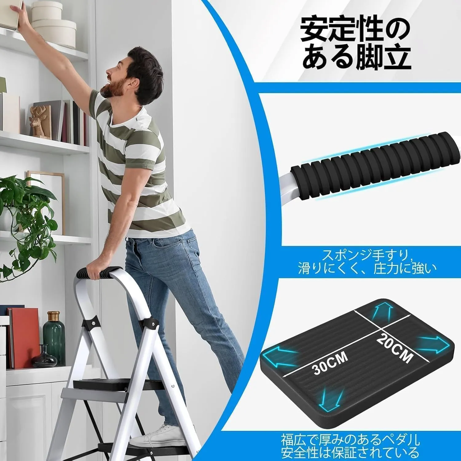 【より安全、より安定し】:安全性を重視し、手すりが付いています。ステップ部は幅と奥行きがあり(ステップのサイズは30×20cmで)、足が置きやすくなっています。高所作業でも安心してご使用いただけます。より安定して立ち上がることができます。