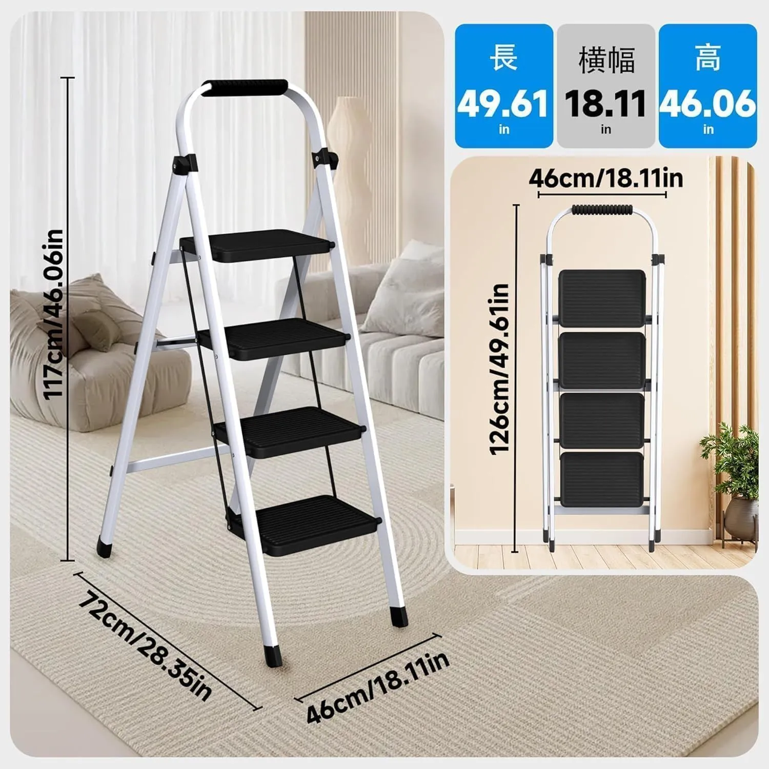 【幅広い用途】:室内の脚立としてだけでなく、洗車、倉庫、屋外の装飾にも使用できます。折りたたんだ完成品をお届けします。 ブランド ROCELIA 商品の寸法 46幅 x 117高さ cm 色 ホワイト 特徴 手すり, 折り畳み式, 耐候性, 軽量, 防滑 商品の重量 4 キログラム 最後までご確認頂き誠にありがとうございました。 上記をご確認頂き、ご購入いただけましたら幸いです。 何かご不明な点がございましたらお気軽にメッセージからお問い合わせ下さい。