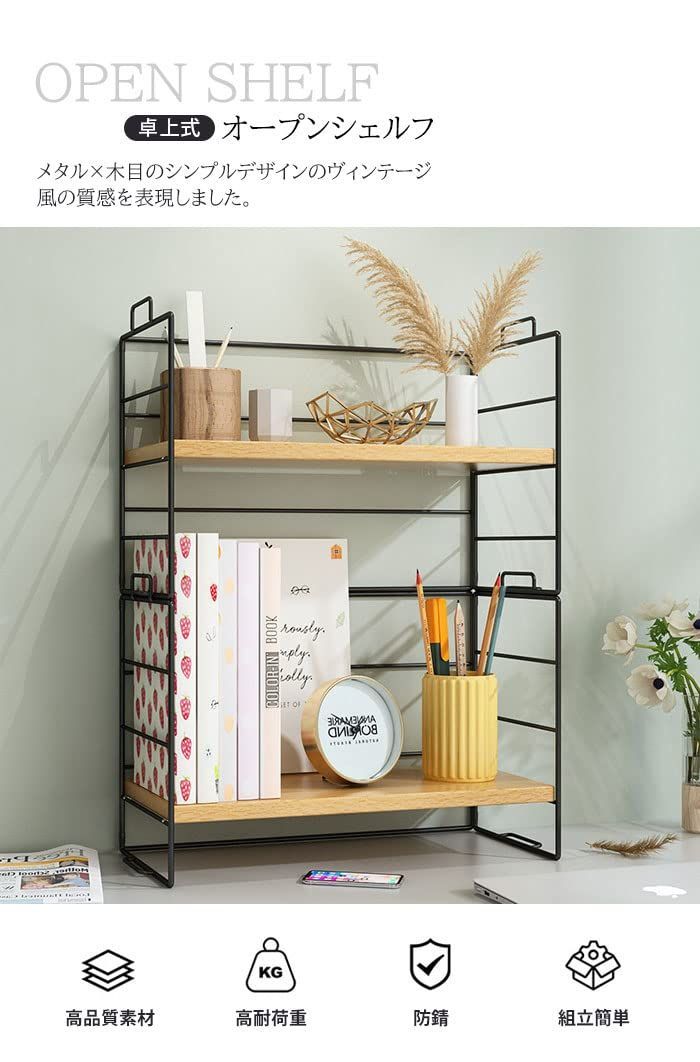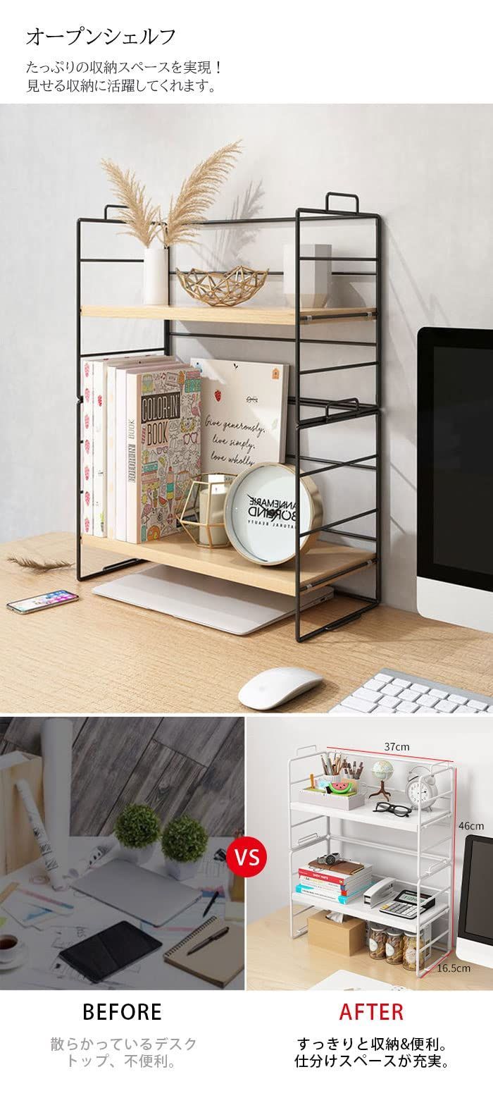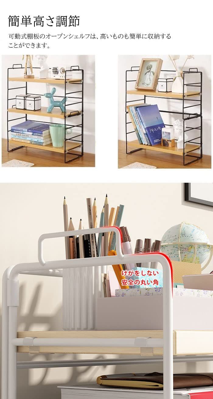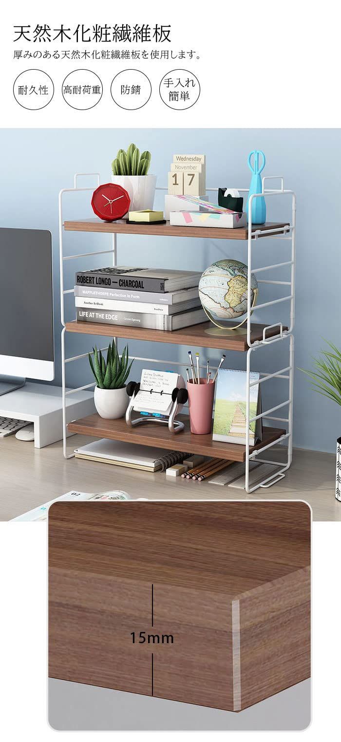 オープンラック 本棚 デスク収納 ラック 上置棚 シェルフ 収納ラック 棚 収納棚 北欧 机上ラック テーブルラック本 文房具 飾り 小物置き 整理 組立簡単 (棚板3枚, ウッド色棚板+白色フレーム)