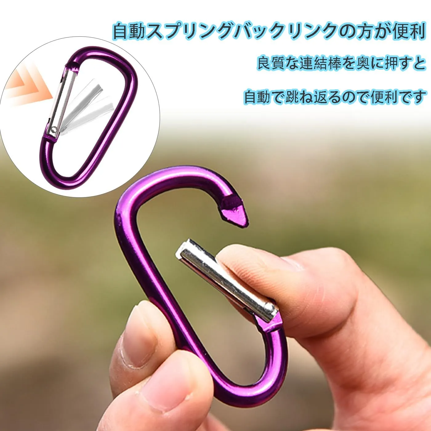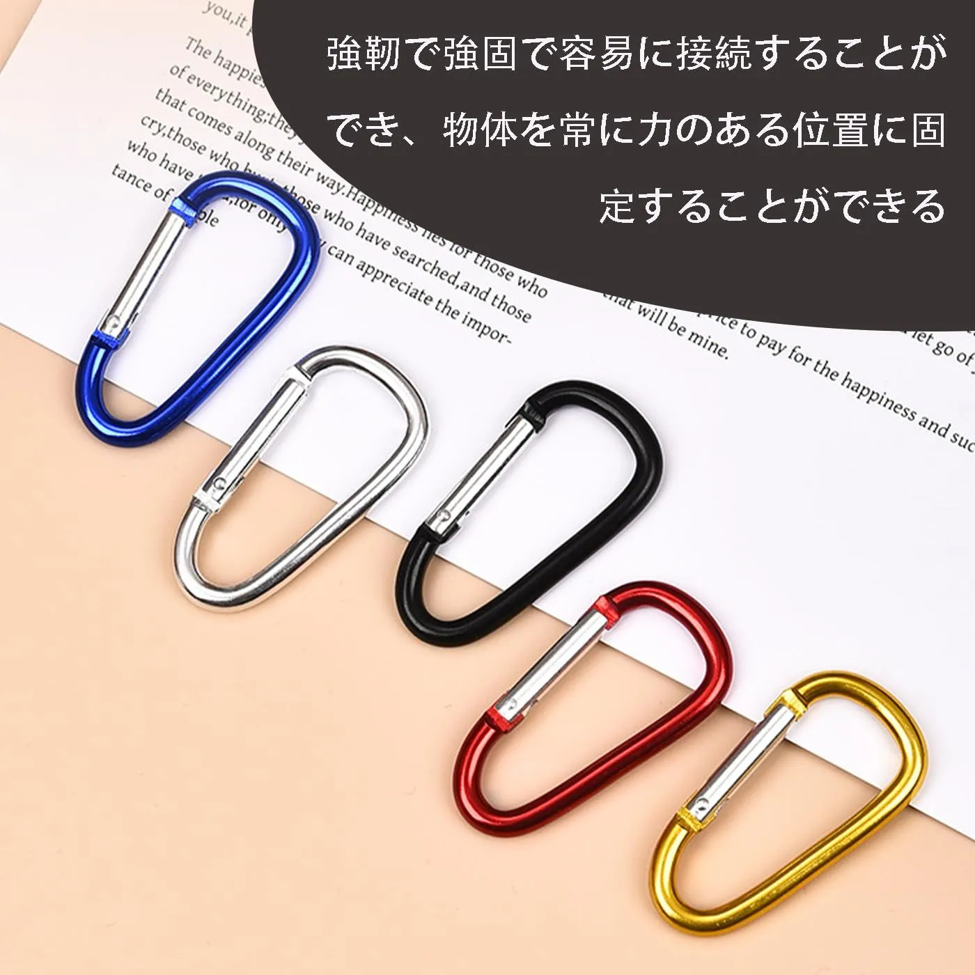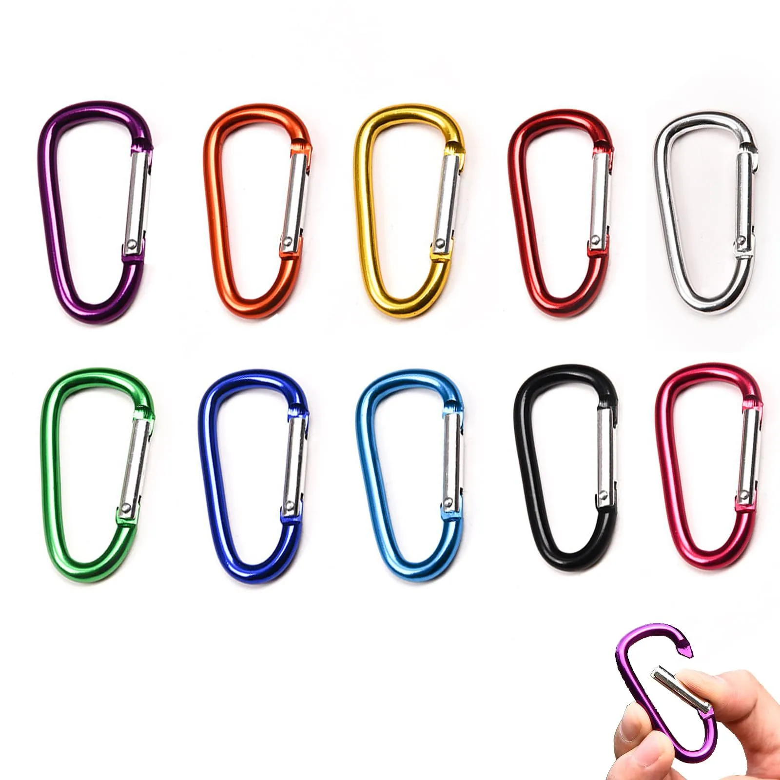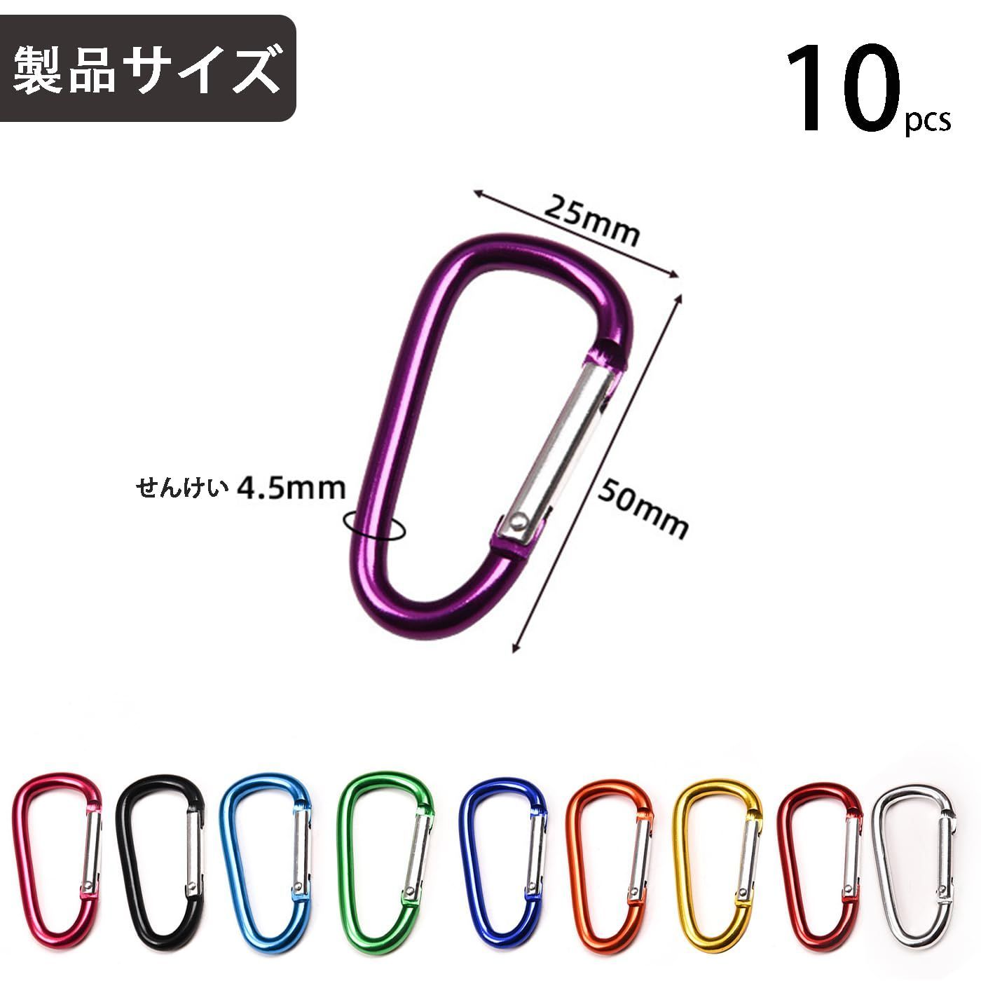 【商品の内容】:D型スナップ10個入り、全10色。サイズは約50 x 25 mm、厚さは4.5 mm。注意:荷重を受けるクライミングや登山シーンには向いていません。