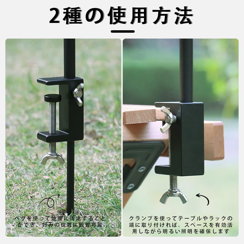 【2種の使用方法】地面とテーブルの両方で使用できる2WAYスタイル。ペグを使って地面に固定することができ、好みの位置に設置可能。クランプを使ってテーブルやラックの端に取り付ければ、スペースを有効活用しながら明るい照明を確保します。