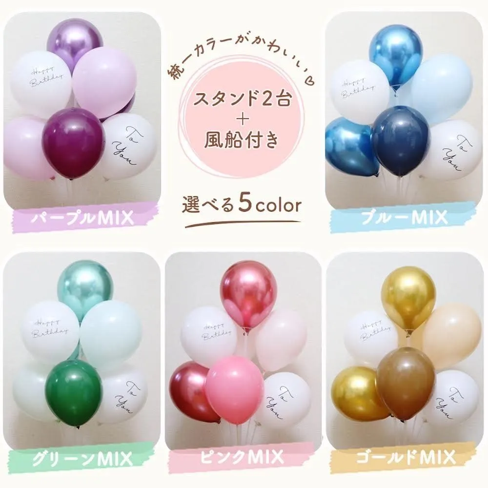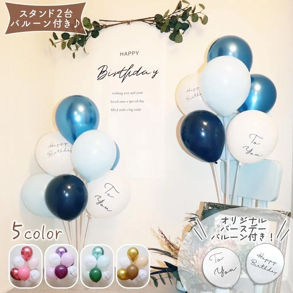 【即日発送】ブルーMIX) (2台+風船(誕生日) 2セット MIX メタル くすみ 女の子 男の子 ホルダー バルーン 床用 飾り 誕生日 バースデー 風船セット バルーンスタンド