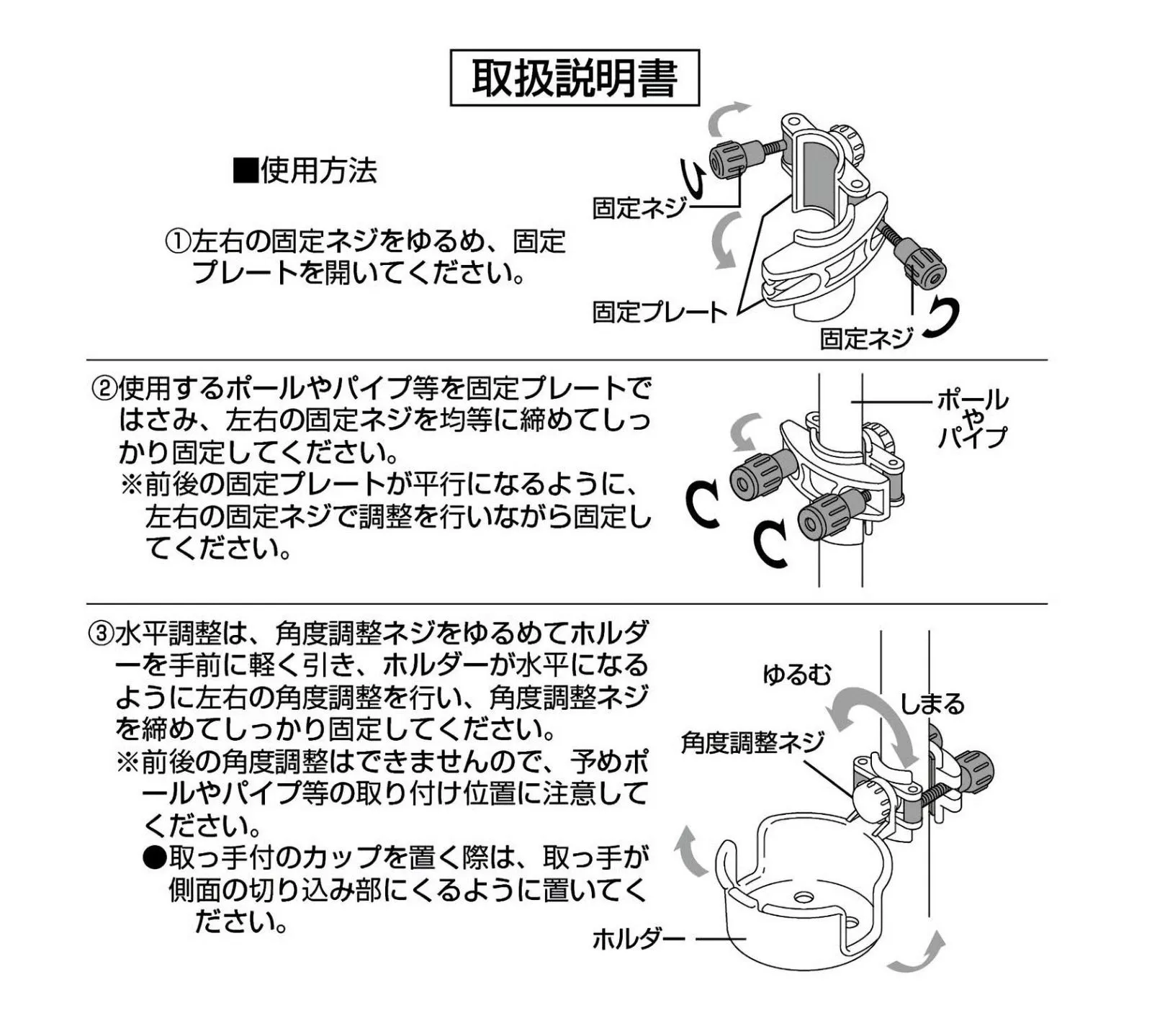 材質:本体/ポリプロピレン(耐熱温度120度)、角度調整ネジ・固定プレート/ABS樹脂、固定ネジ/ポリカーボネート、パッキン/天然ゴム