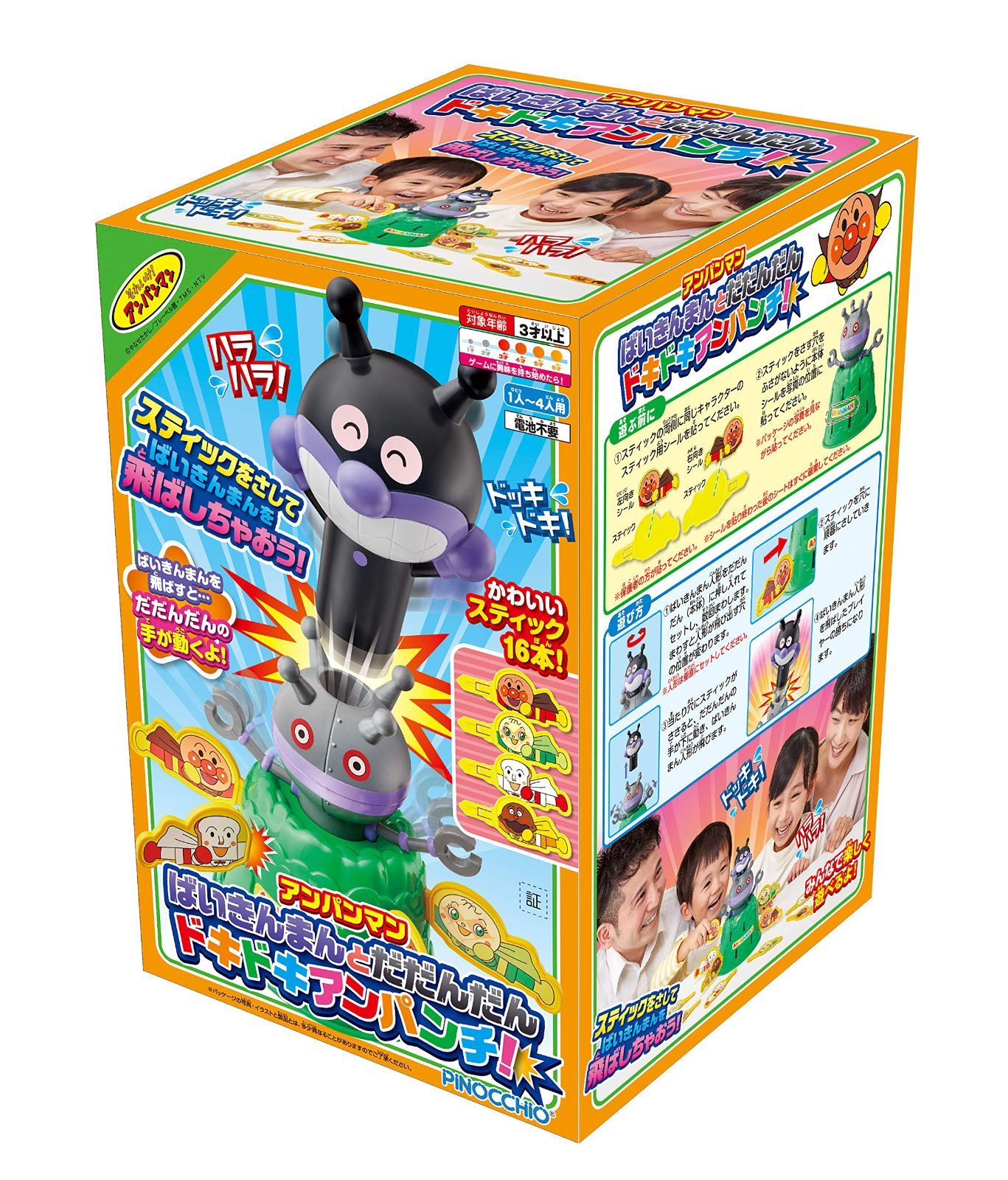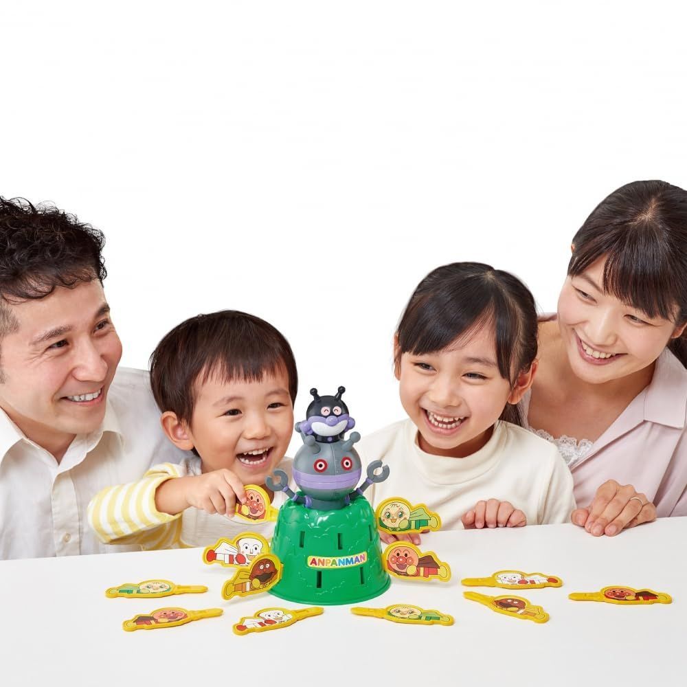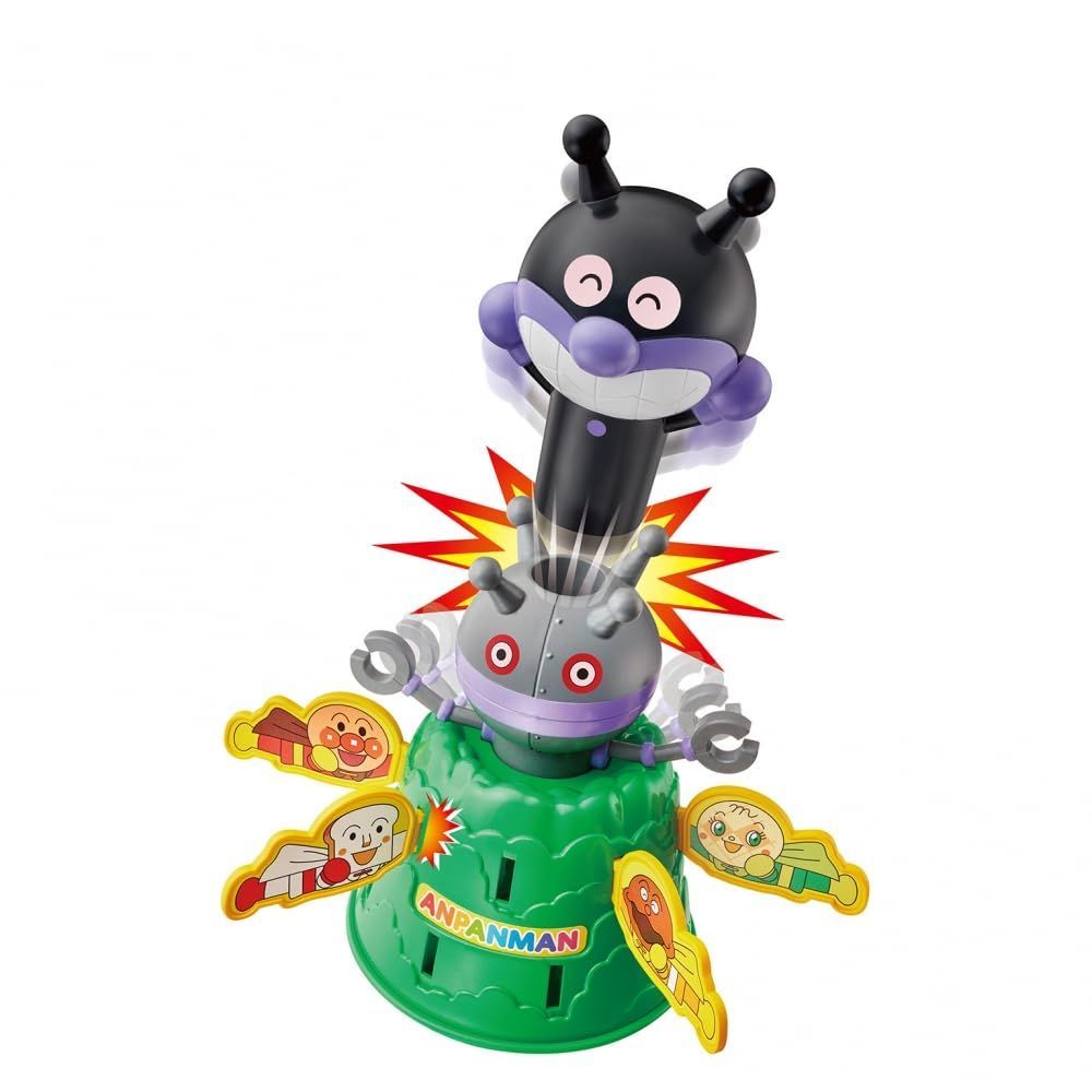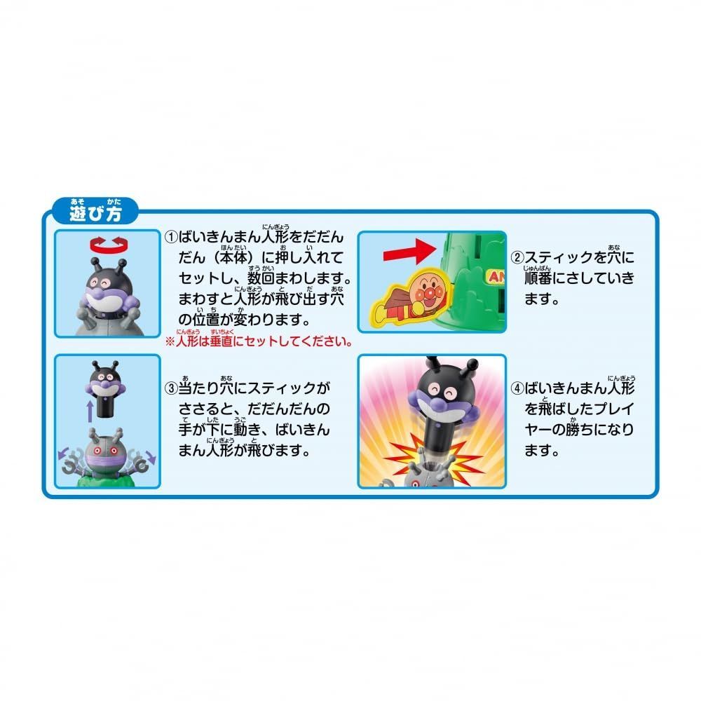 あたりの場所に差し込むと、ばいきんまん人形がポンッと飛び出す、ハラハラドキドキのゲームが楽しめます!