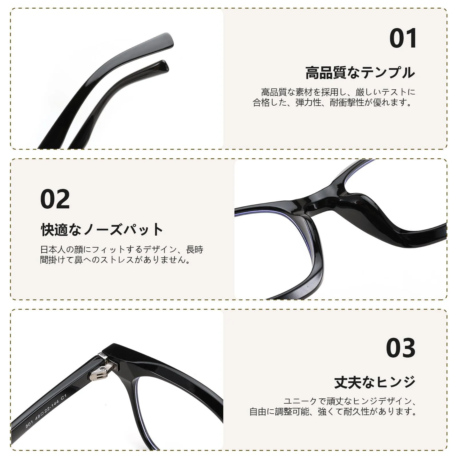 【スプリングヒンジ】耐久性に優れたスプリングヒンジを採用しており、頭のサイズに合わせてフレームが柔軟に調整されます。これにより、どんな顔の形にもフィットしやすく、快適な装着感を実現します。またネジの緩みの心配もなく、耐久性も大幅にアップしました。