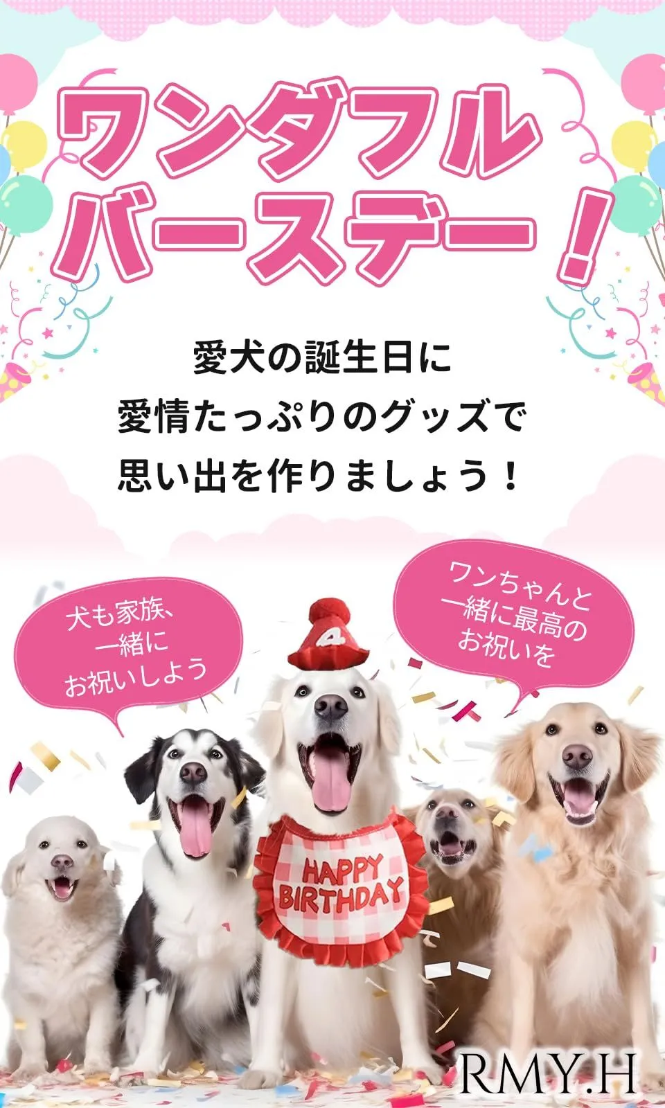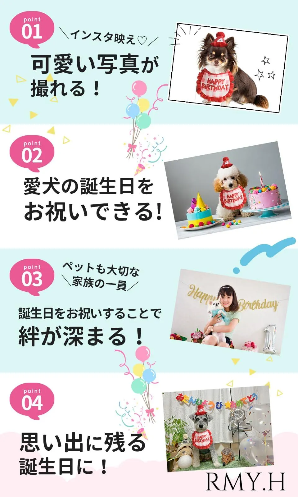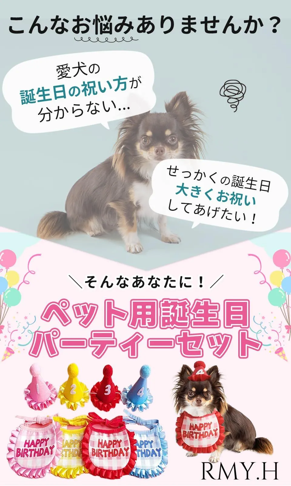 【商品の強み】可愛いデザインの帽子で簡単に装着できます。よだれかけはお祝いのメッセージがプリントされており優しい素材の為安心してペットの首に巻けます。数字は0~9の数字がついており年齢を問わず再利用も可能です? ??