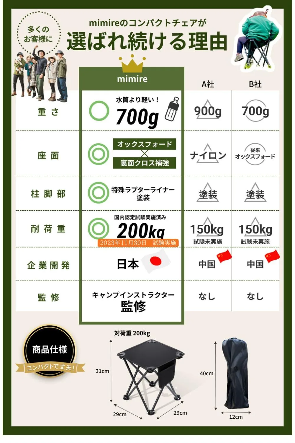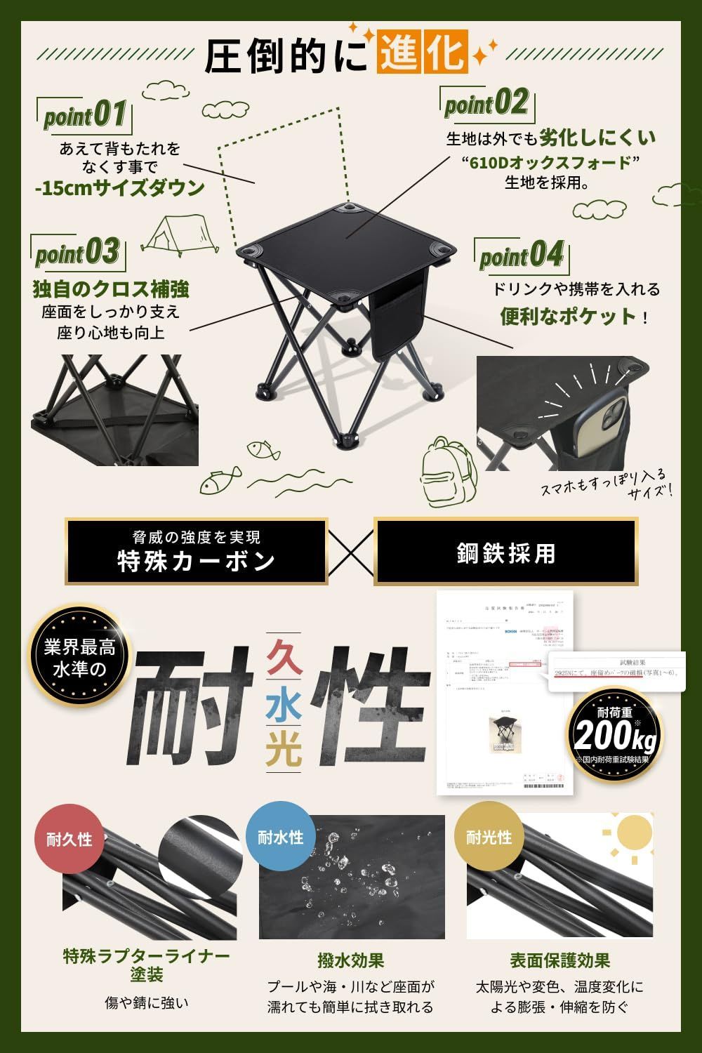 【既存商品を大幅改善!業界最高水準の耐久性】脚部のパイプはラプターライナー塗装という特殊塗装を行うことで、表面の保護をより強力に行い、耐久性・耐水性・耐光性を大幅に向上しております。また座面には610Dオックスフォード生地を採用し、撥水性・耐摩擦性・通気性を向上し、より長く安心してお使いいただけます。座面裏側にはクロスで補強を追加し、座った際に沈み込みづらく、より強靭な座面へと進化させました。この軽さとコンパクトさで国内認定試験で耐荷重は驚きの200kg!大人の膝の上に子供が乗っても安心してご使用いただけます。 ??