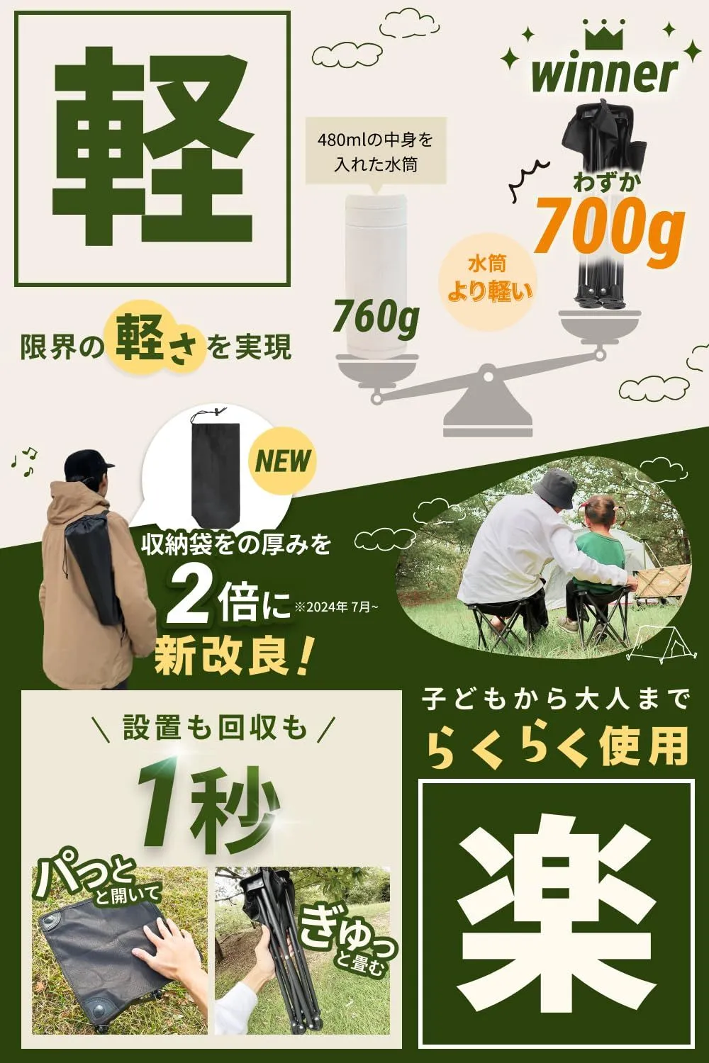 【重さたったの0.7kg!誰でもラクラク使用!】脚部に軽量カーボンスチールを使用し、クロス構造にすることで、限界の軽さを実現しつつ、十分な強度を確保しました。500ml水筒とほぼ同じ重さなので、徒歩での移動時も楽に携帯が可能です。使用する際は椅子を収納袋から取り出し、サッと開くだけ。使用後は折り畳みしまうだけで誰でも楽にご使用いただけます。 ??