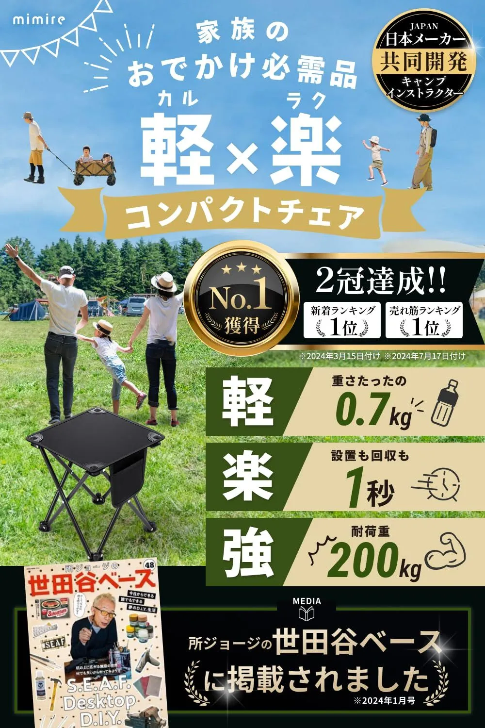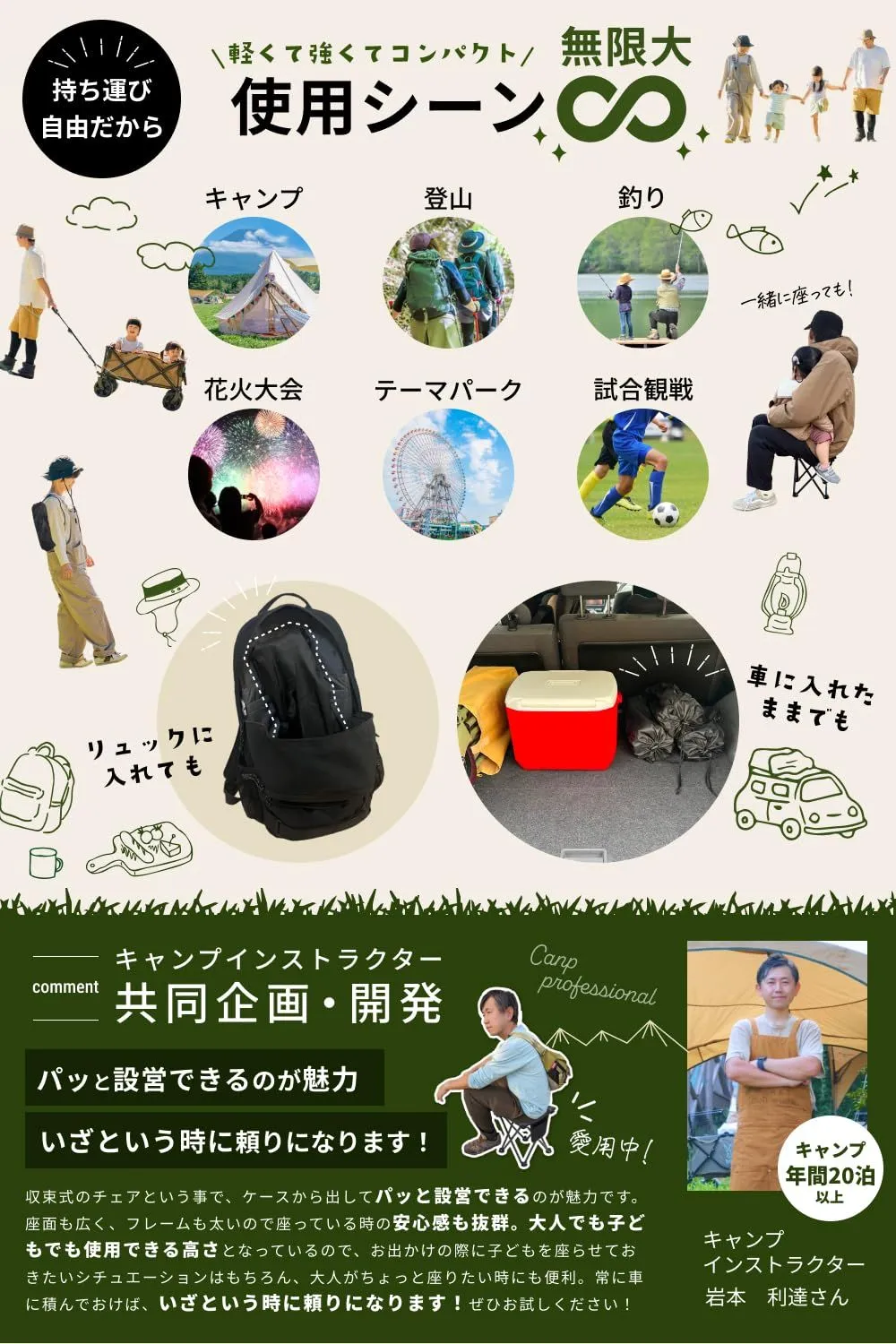 【超コンパクト使用シーン無限大】イス脚部の特殊ヒンジにより、使用後はコンパクトに折畳が可能です。また、専用のオックスフォード生地の収納袋にしまうことで、どこへでもすぐに持ち運びが可能です。キャンプ・BBQ・釣り・花火大会・テーマパーク待ち時間・大阪万博・ピクニック・花見・子供の試合観戦など様々なシーンでご使用いただけ、車に一台置いておけばどこでも安心なアウトドアアイテムです。 ??