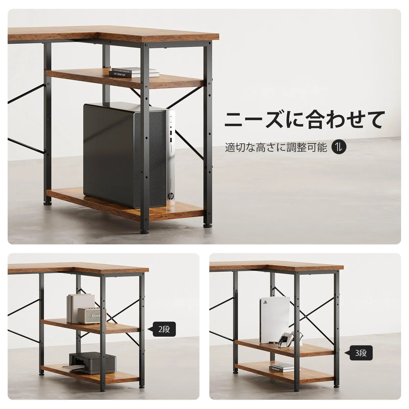 【左右調整可能】デスクトップは組み合わせ式で、左右の位置調整が可能です。調整により、小さな板と下の棚も連動して位置変更できます。引き出しの位置は左側または右側に取り付け可能で、簡単に設置できます。