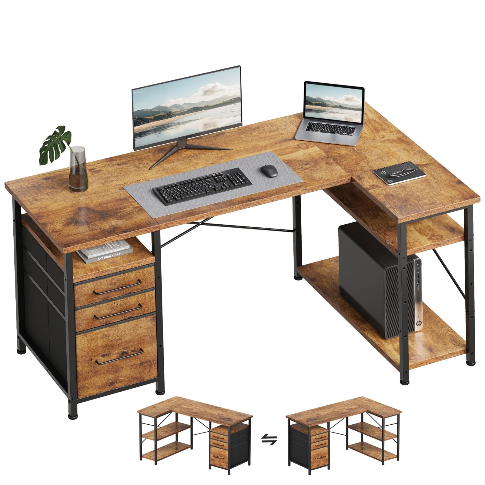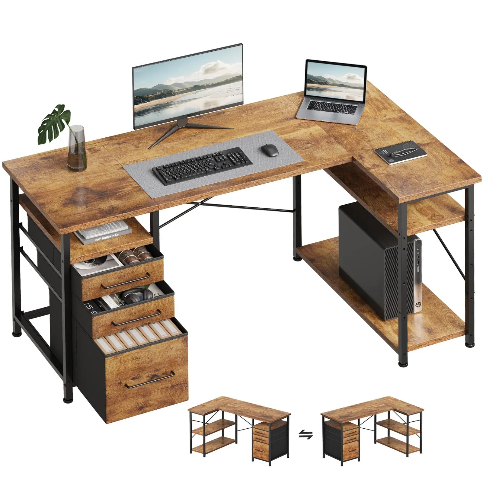 Maihail パソコンデスク l字デスク 机 勉強机 学習机 右棚左棚 幅120cm pcデスク コーナーデスク 本棚付き 引き出し付き 幅120cm ピンテージ