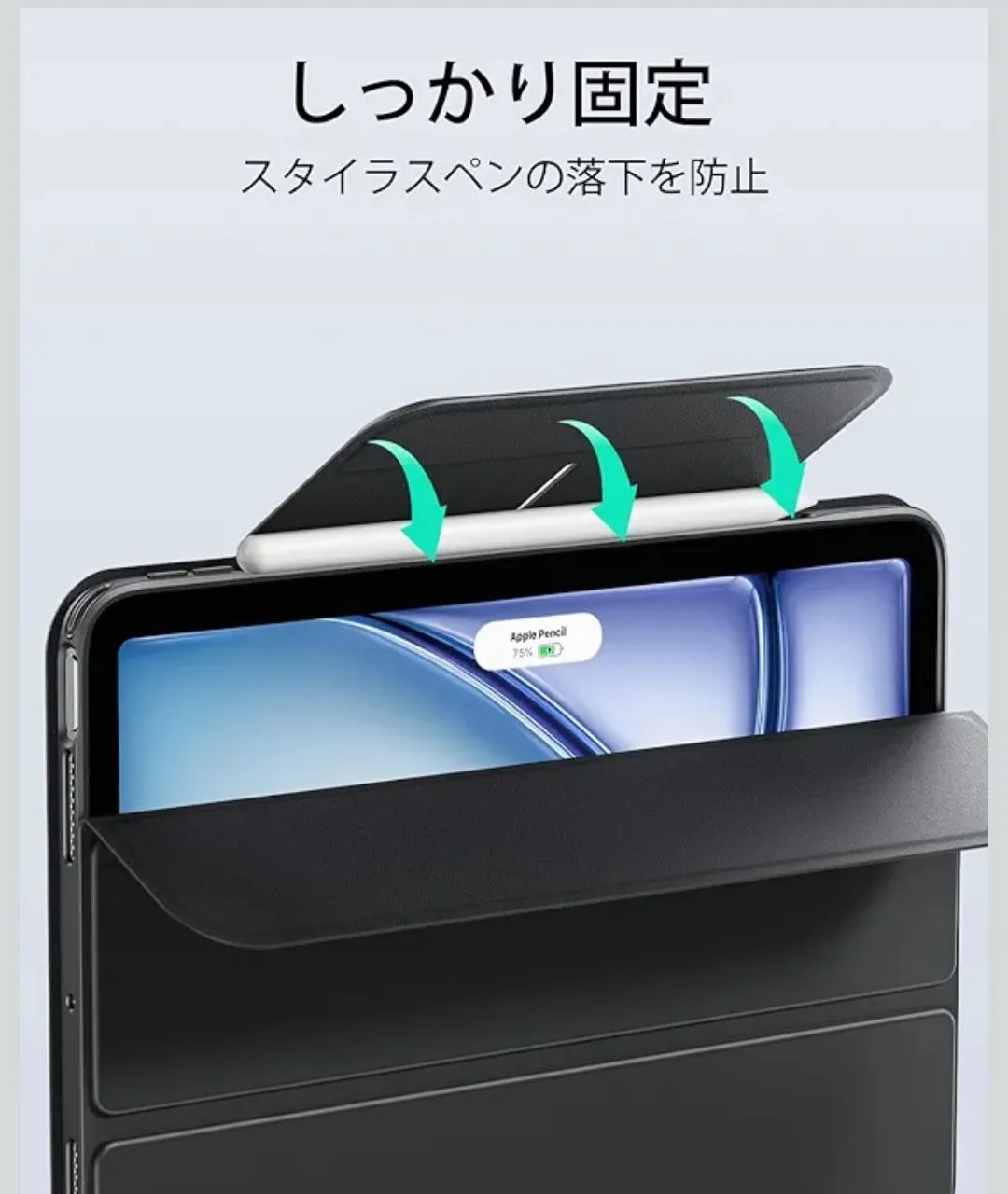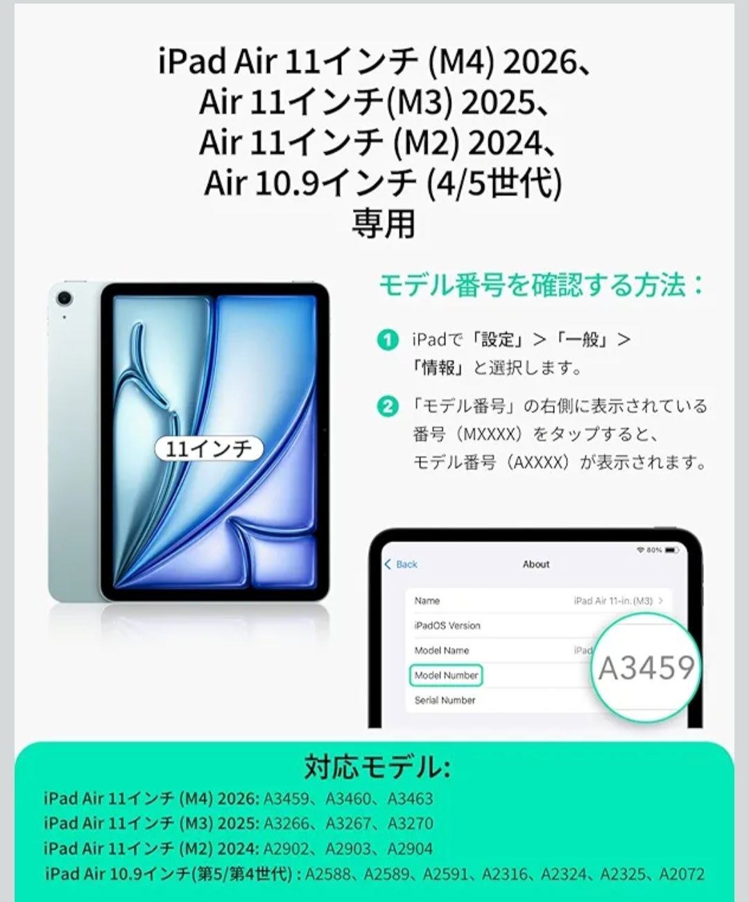 【対応機種】本製品はiPad Air 11インチ(M4/M3/M2、2026/2025/2024)、iPad Air 10.9インチ(第5/4世代、2022/2020)に対応した専用設計です。対応モデル番号:Air 11インチ(A3459、A3460、A3266、A3267、A2902、A2903)、Air 10.9インチ(A2316、A2324、A2325、A2072、A2588、A2589、A2591)。※ご注意:上記以外のiPadには対応しておりません。ご購入前に必ずiPad本体背面下部のモデル番号「AXXXX」をご確認ください。