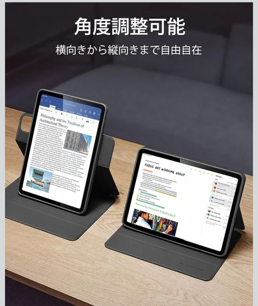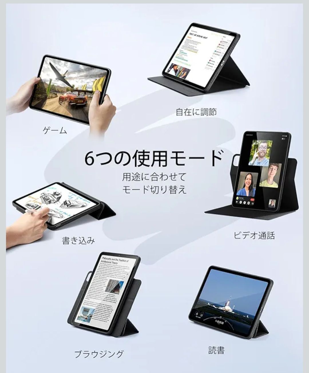 【複数使用モード】:縦向きと横向きの調整が可能な6つのユニークな使用モードがあり、iPadを好きなように変身させることができます