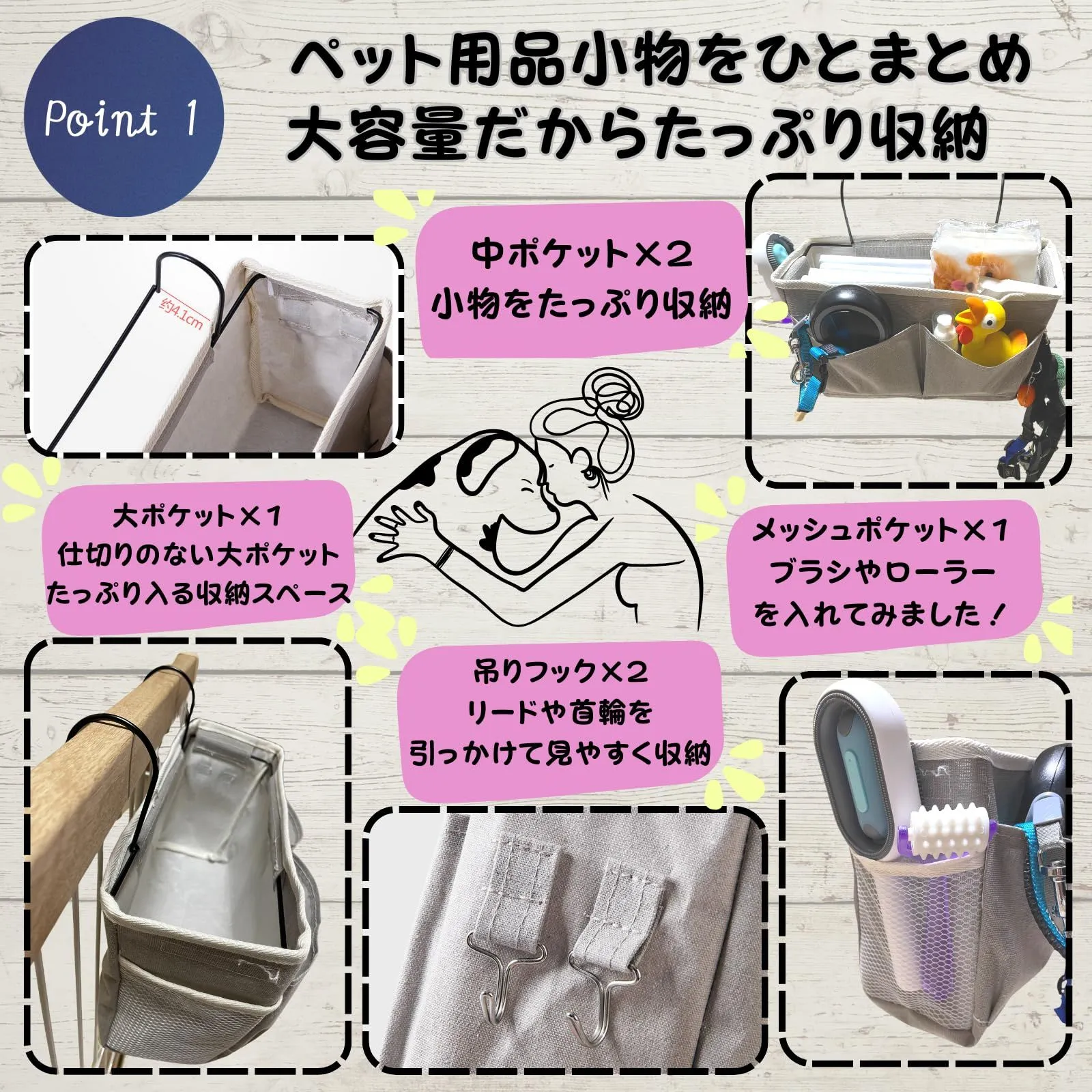 【多機能デザイン】吊り下げ収納には複数のポケットがあり、小さなアクセサリーから大きなアイテムまで、様々なサイズのペット用品を整理できます。猫や犬のサークルにもフィットし、空間を有効活用しながらおしゃれに収納できます。