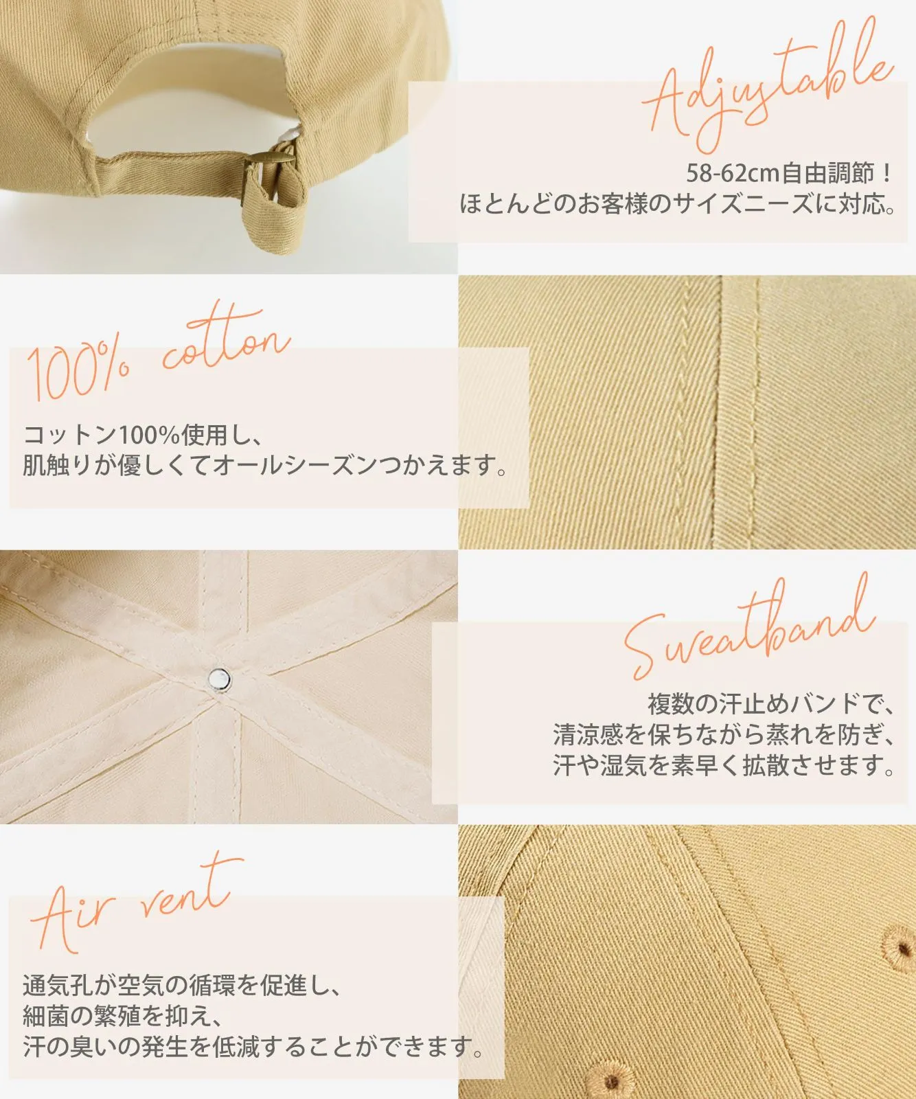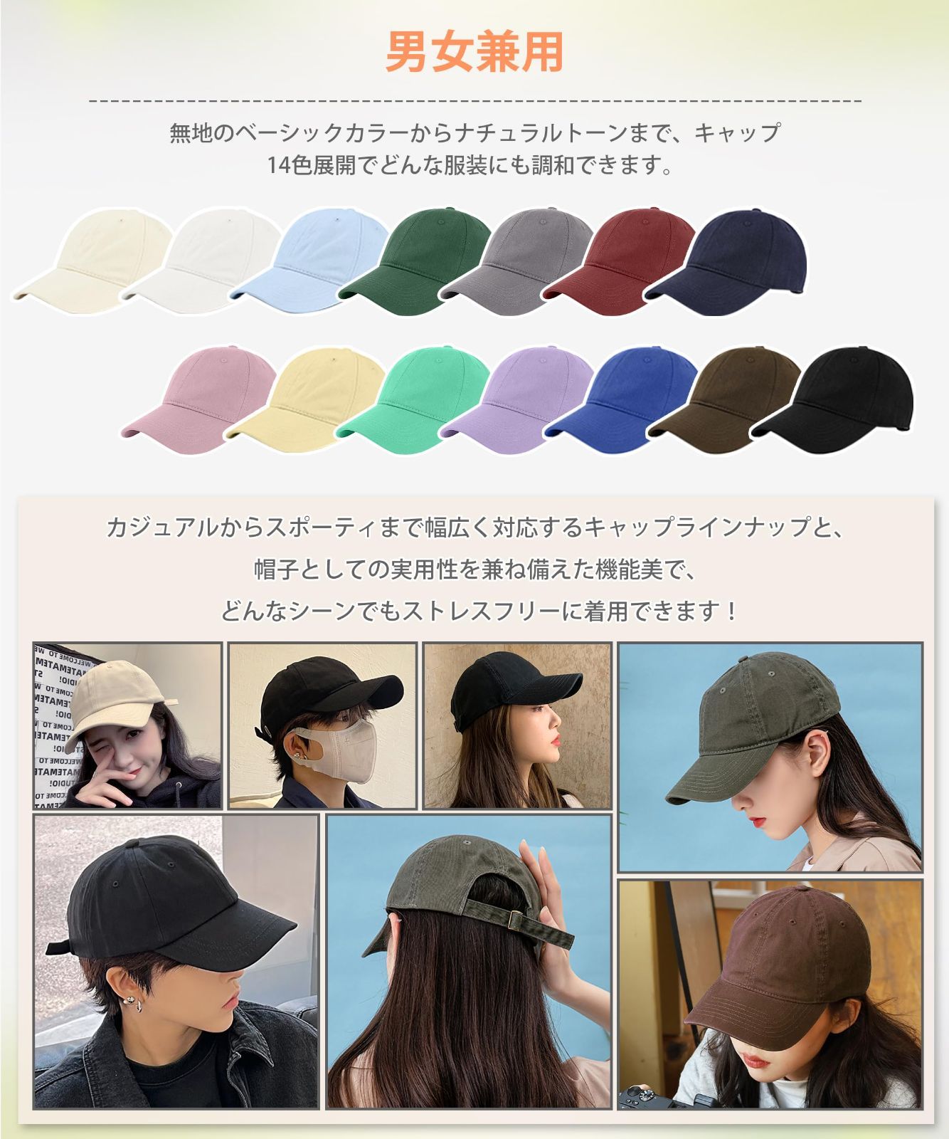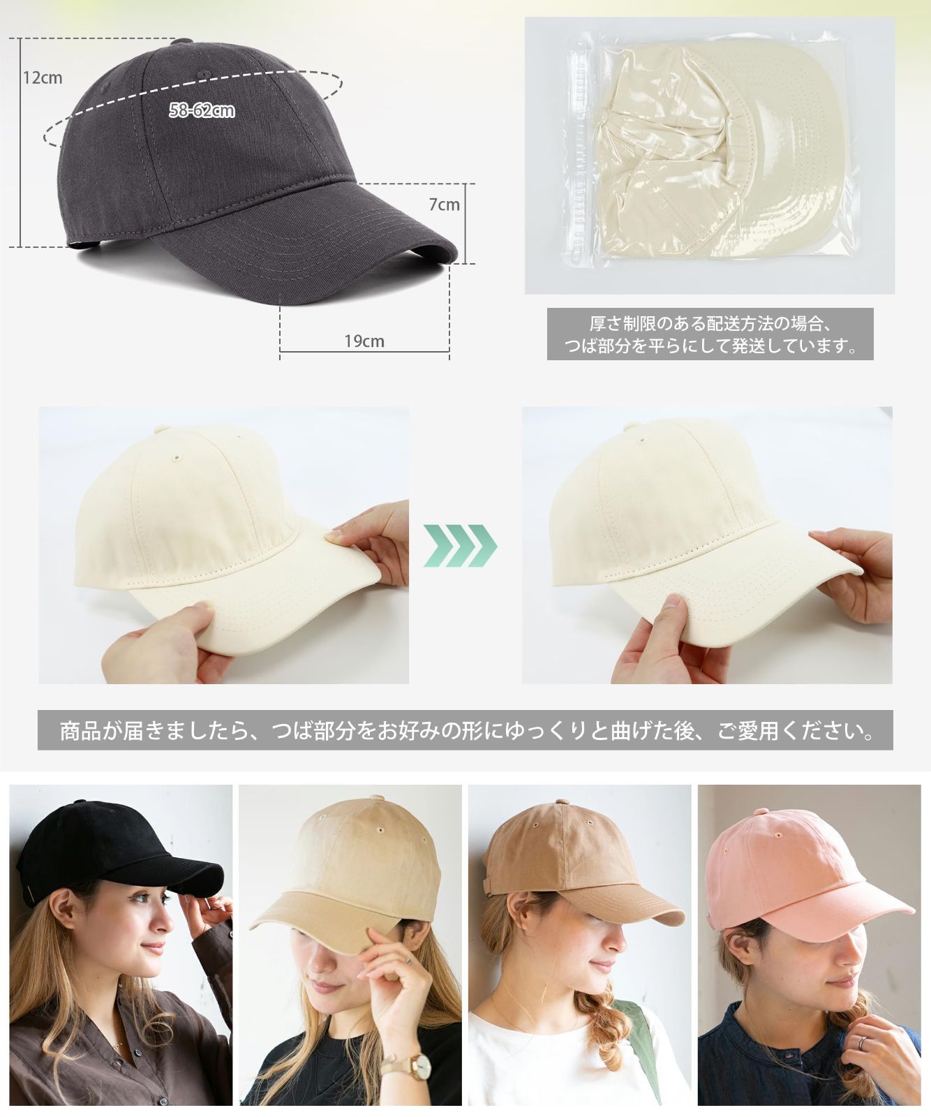 【58~62cm調節可能・完璧な小顔効果】キャップ レディースのメタルバックルが後部に配置され、頭囲サイズを58cmから62cmまで自由に調節可能です。適度なクッション性と伸縮性ある素材で、帽子が頭の形に「ぴったり」と密着し、長時間装着しても圧迫感ゼロです!広めのキャップのひさしとふんわりとした帽子の奥行きが、顔の輪郭を優しく包み込むように整えます。丸顔やオーバーサイズのフレームメガネをお使いの方でも、自然なシルエットで「小顔効果」を演出します。日常から外出まで、どんなシーンでもストレスフリーな着用感で、自分らしいスタイルをサポートする万能なレディースキャップです。 最後までご確認頂き誠にありがとうございました。 上記をご確認頂き、ご購入いただけましたら幸いです。 何かご不明な点がございましたらお気軽にメッセージからお問い合わせ下さい。