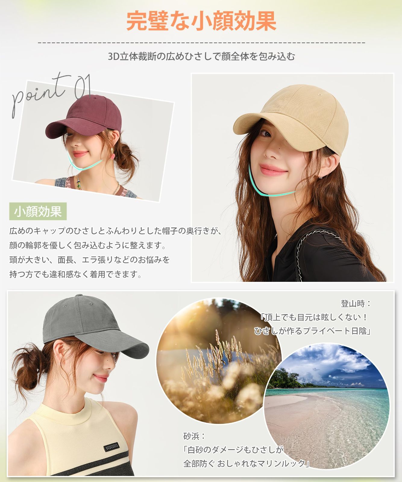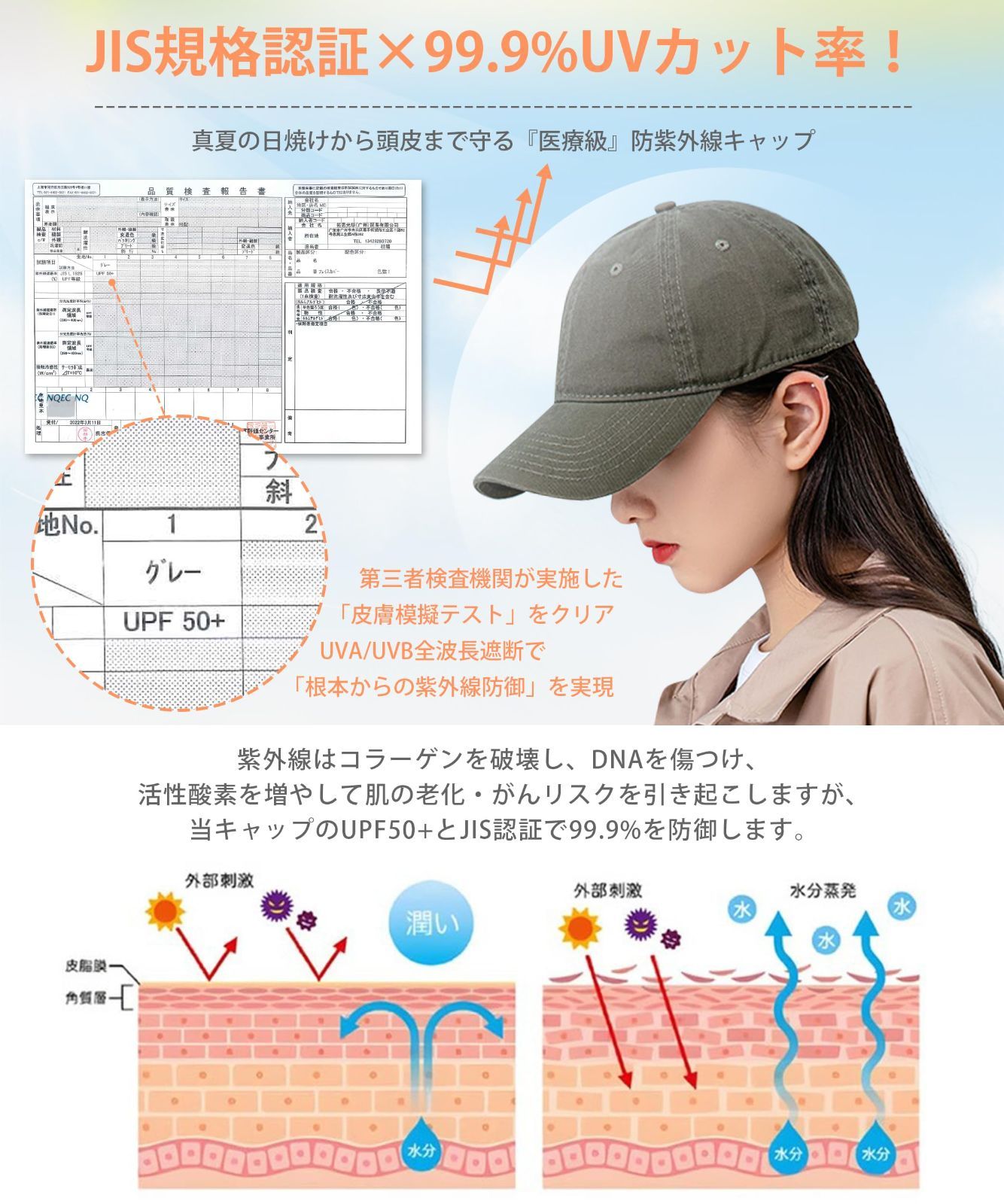 【UV遮断率99.9%以上認証・3D立体裁断広つば】レディースキャップに採用している素材は、第三者検査機関によるJIS規格準拠のテストを通過し、UVカット率99.9%以上・UPF50+を達成しています。この帽子はUVA/UVBを全波長帯で遮断するため、日焼けによる皮膚や頭皮のダメージを根本から防止できます。3D立体裁断の広つばレディースキャップは顔全体をカバーし、鼻筋・目元・頬骨の露出ゼロ設計です。特に登山時の直射日光や砂浜での反射紫外線にも効果的で、サングレス不要にも最適な帽子です。