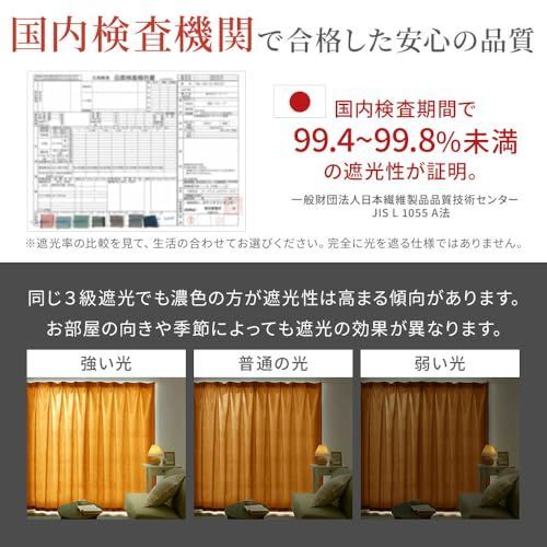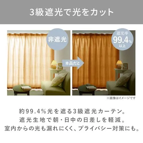 <3級遮光で光をカット>約99.4%光を遮る3級遮光カーテン。遮光生地で朝・日中の日差しを軽減。室内からの光も漏れにくく、プライバシー対策にも。