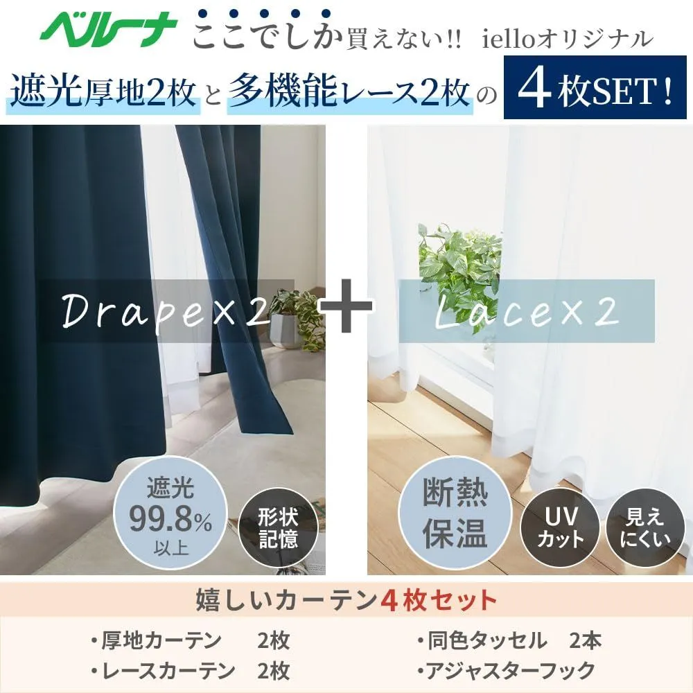 ベルーナ(BELLUNA) カーテン 4枚セット 遮光 1級 遮熱 uvカット 遮光カーテン 4枚セット おしゃれ 北欧 シンプル 幅100 タッセル付 カーテン2枚 レース2枚 2枚組 アジャスターフック付 洗える (285263-156)
