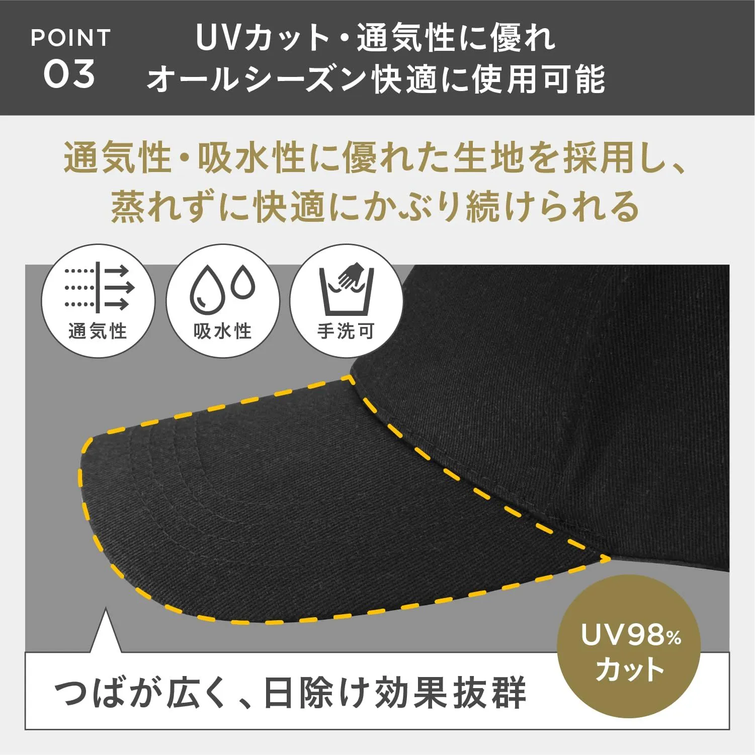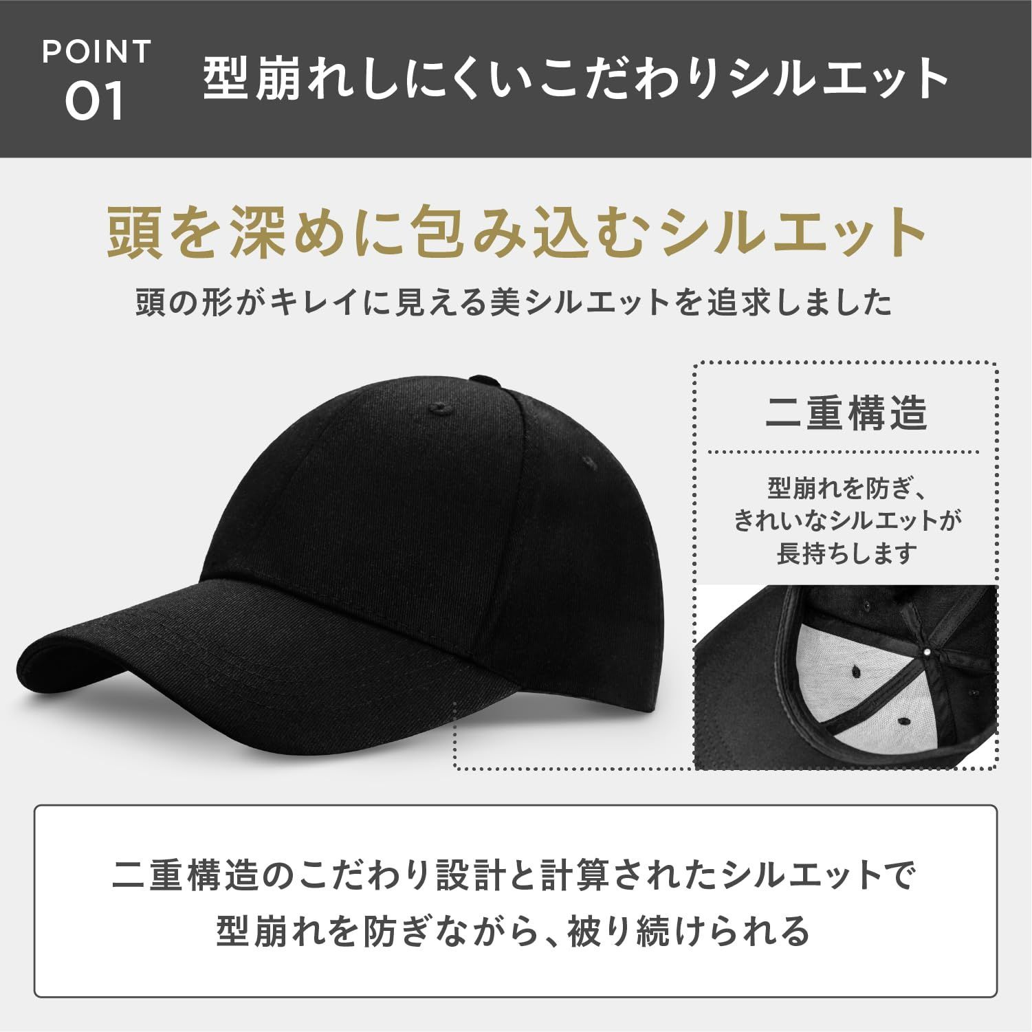 【究極のフィット感】コットン素材のベースボールキャップは快適なかぶり心地とフィット感にこだわりました。日本人の頭の形状に合わせて、キャップのフロントやサイドの長さを調整し、最適な深さと幅を追求。帽子のクラウン部分に着目し、あなたにぴったり合う形状を実現しました。