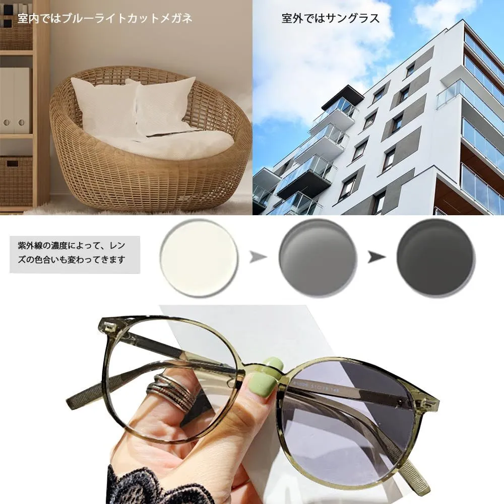 変色調光機能:レンズが紫外線に反応して色が変わり、屋外ではサングラスのように暗くなり、屋内ではクリアになります。曇り、晴れのような天気に気軽に対応することができます