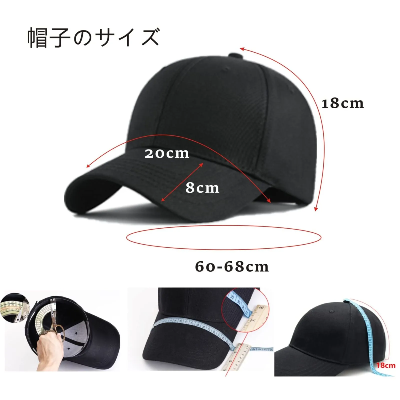 ◆頭周り:約60~68(アジャスターで調節)、深さ:約13、つば幅:約8。