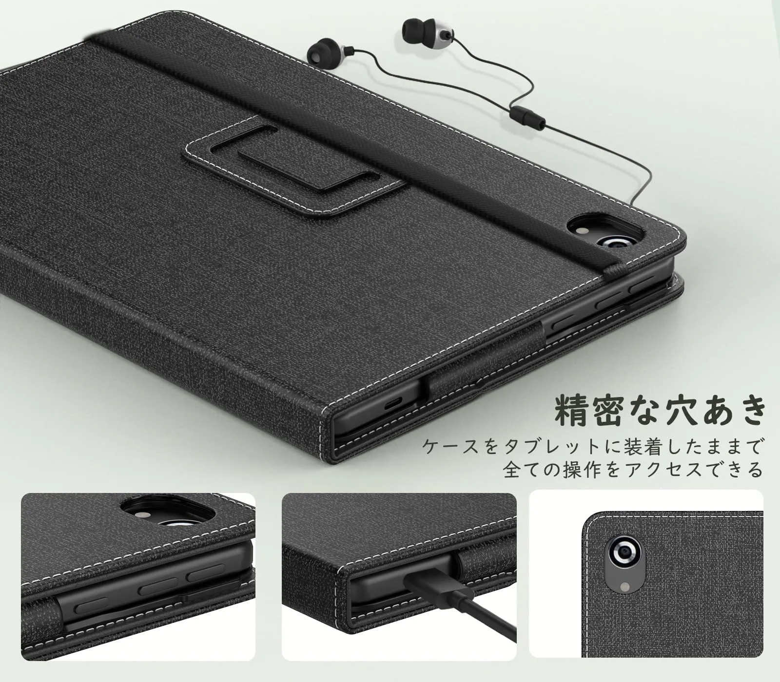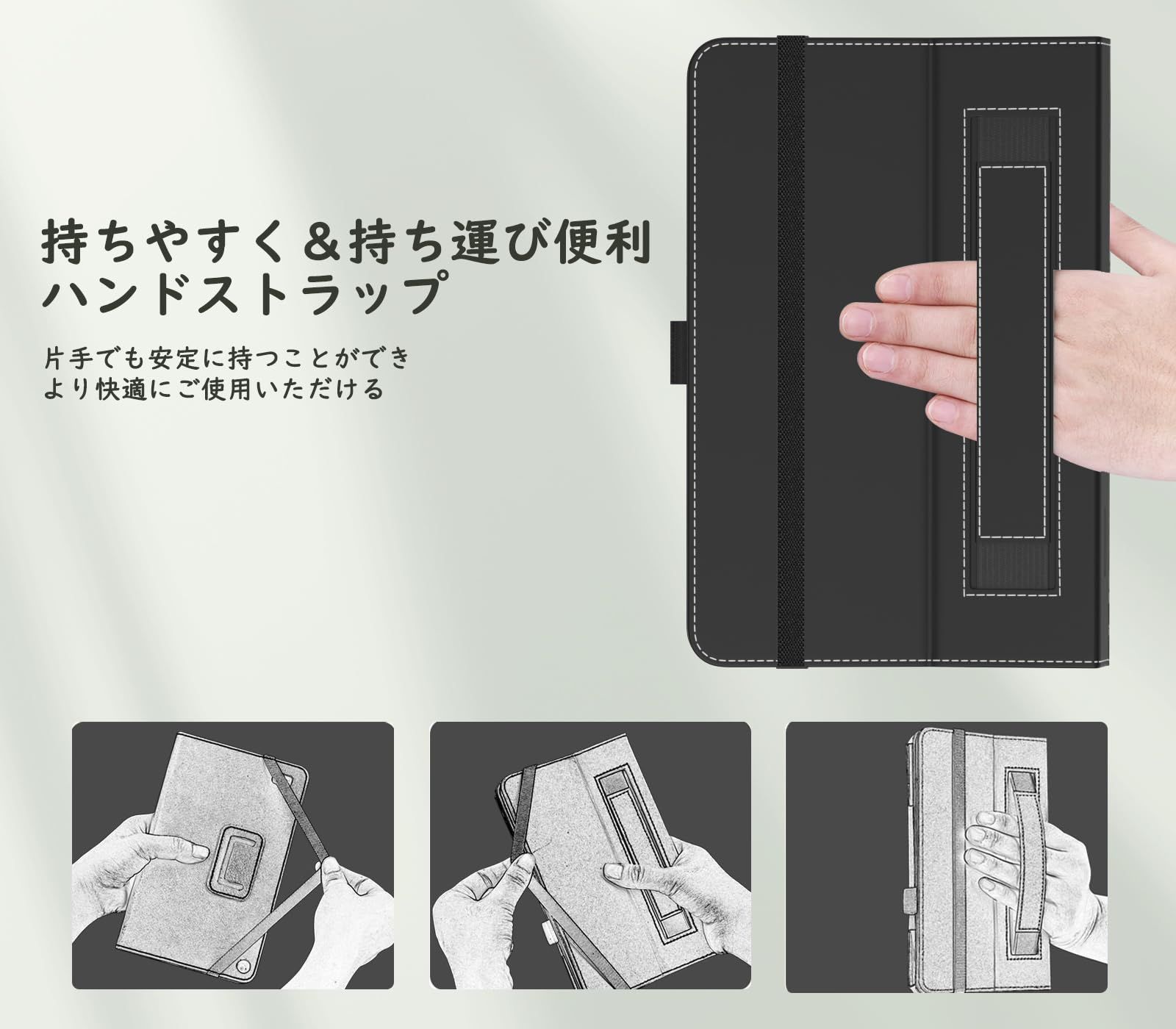 「ぴったり装着」専用設計された全面保護ケースとなっているため、ケースを装着したままで、すべての機能にアクセスできます。フタの内面には手ホルダーもついてあり、手軽に片手で本のように持ち上げることができます。