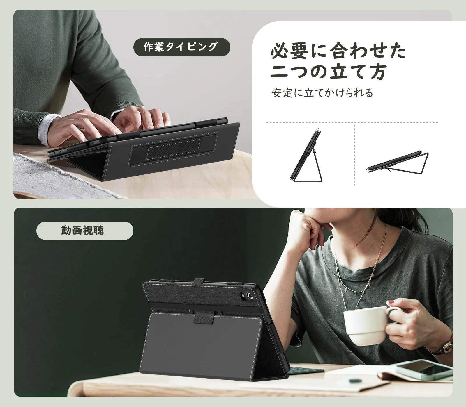 「スタンド機能」背部部分には折り曲げて安定にスタンドに立て掛けることになり、両手解放でご必要に合わせて角度を変更可能で、動画鑑賞を楽々に楽しんだり、仕事やゲームなどもより快適に進められます。